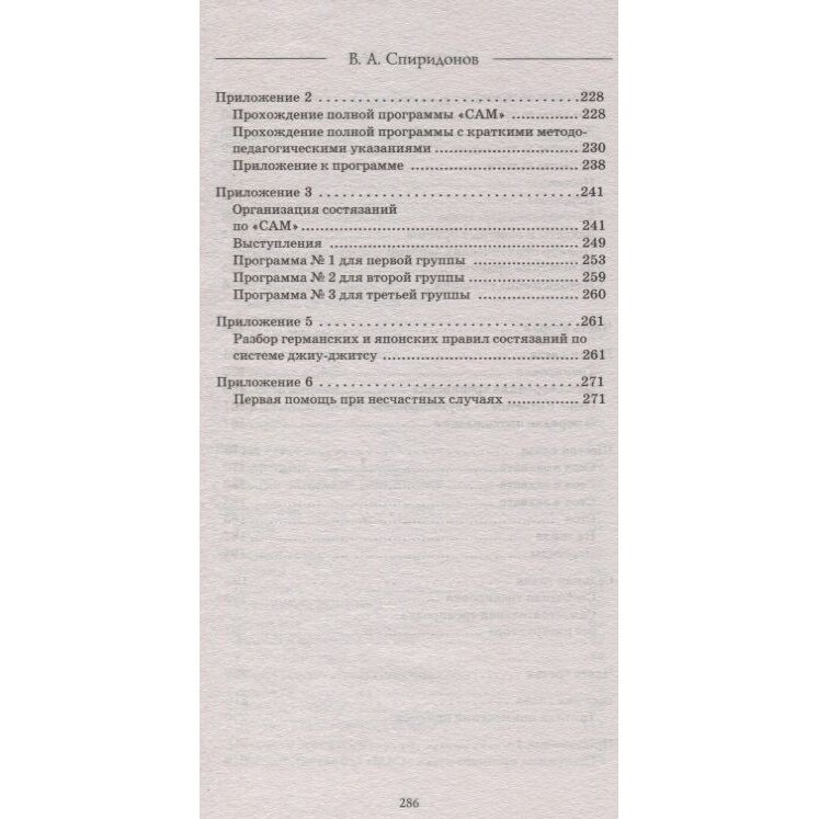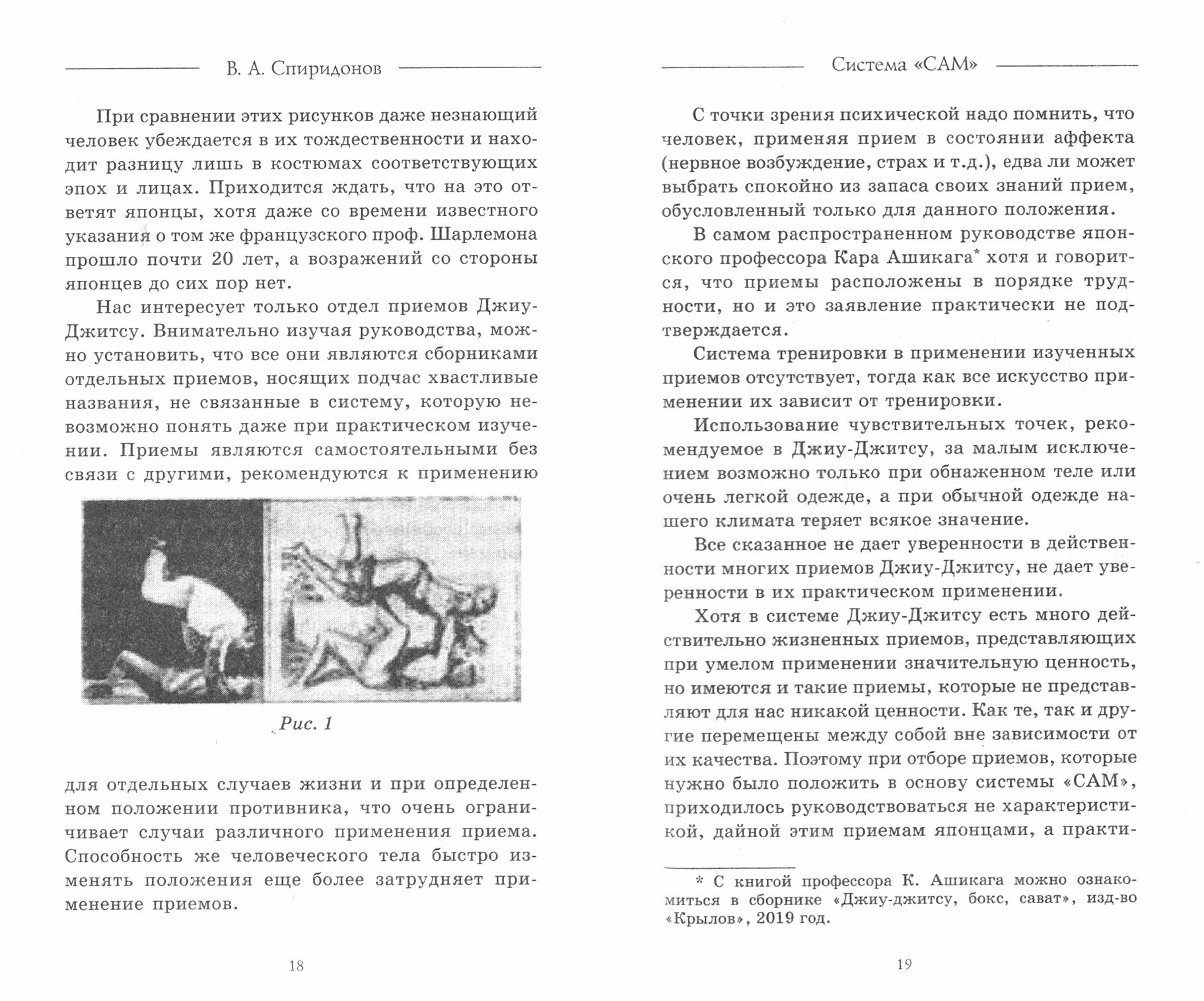 В. А. Спиридонов разработал собственную систему самозащиты "САМ". Автор взял из тысячи приемов дзю-до, джиу-джицу всего лишь два-три десятка и построил на них свою систему с прибавлением элементов вольной борьбы, бокса и бытовой обороны. Все приемы проверены практически, в жизни. Все приемы доведены до логического конца, то есть заставляют противника отказаться от дальнейшей борьбы и сдаться. В этом главная заслуга автора.