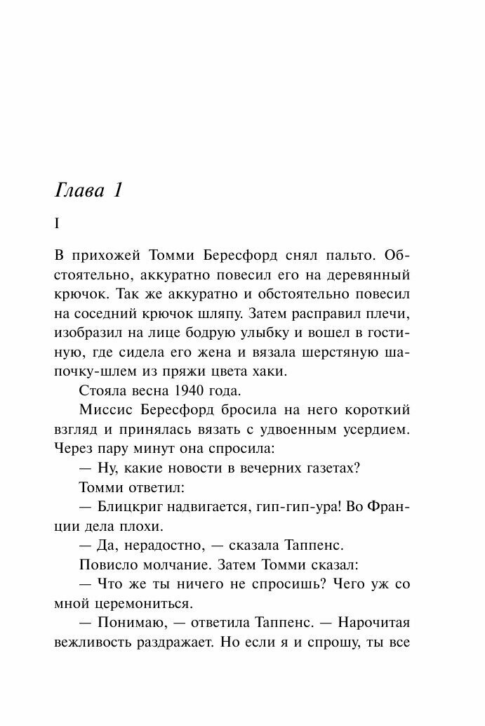 Если бы не сильная личная симпатия к Томми и Таппенс, меня бы, наверное, очень бесило, что раскрытие международного заговора и спасение мира снова доверено пусть и везунчикам, но все-таки дилетантам. Как-то не очень правдоподобно, что непрофессионалов снова и снова привлекают к таким серьезным делам. Но, несмотря на это, мне роман понравился. История интересная, интересные персонажи. Читать было достаточно увлекательно.