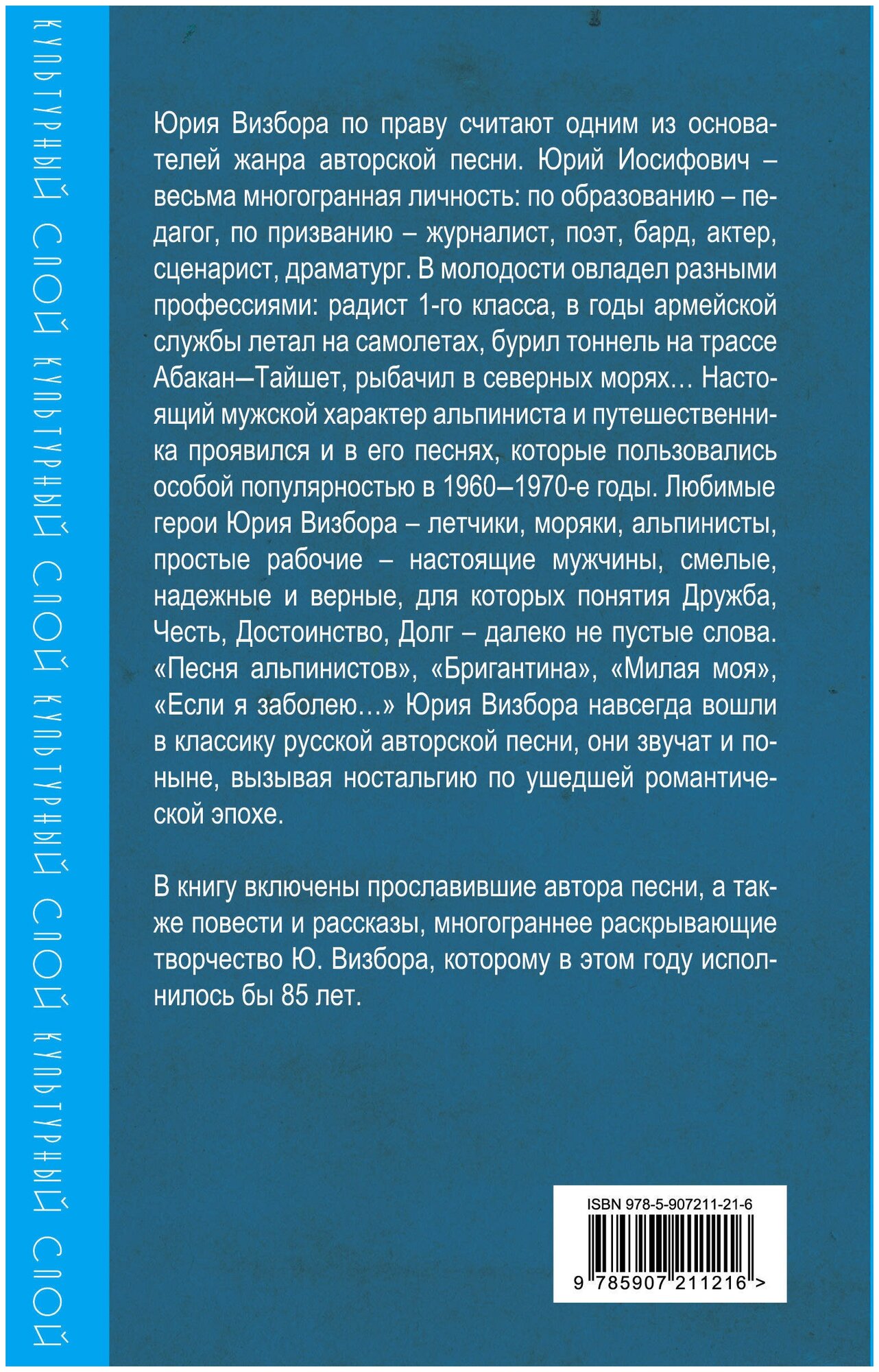 Юрия Визбора по праву считают одним из основателей жанра авторской песни. Юрий Иосифович – весьма многогранная личность: по образованию – педагог, по призванию – журналист, поэт, бард, актер, сценарист, драматург. В молодости овладел разными профессиями: радист 1-го класса, в годы армейской службы летал на самолетах, бурил тоннель на трассе Абакан-Тайшет, рыбачил в северных морях… Настоящий мужской характер альпиниста и путешественника проявился и в его песнях, которые пользовались особой популярностью в 1960-1970-е годы. Любимые герои Юрия Визбора – летчики, моряки, альпинисты, простые рабочие – настоящие мужчины, смелые, надежные и верные, для которых понятия Дружба, Честь, Достоинство, Долг – далеко не пустые слова. "Песня альпинистов", "Бригантина", "Милая моя", "Если я заболею…" Юрия Визбора навсегда вошли в классику русской авторской песни, они звучат и поныне, вызывая ностальгию по ушедшей романтической эпохе. В книгу включены прославившие автора песни, а также повести и рассказы, многограннее раскрывающие творчество Ю. Визбора, которому в этом году исполнилось бы 85 лет."