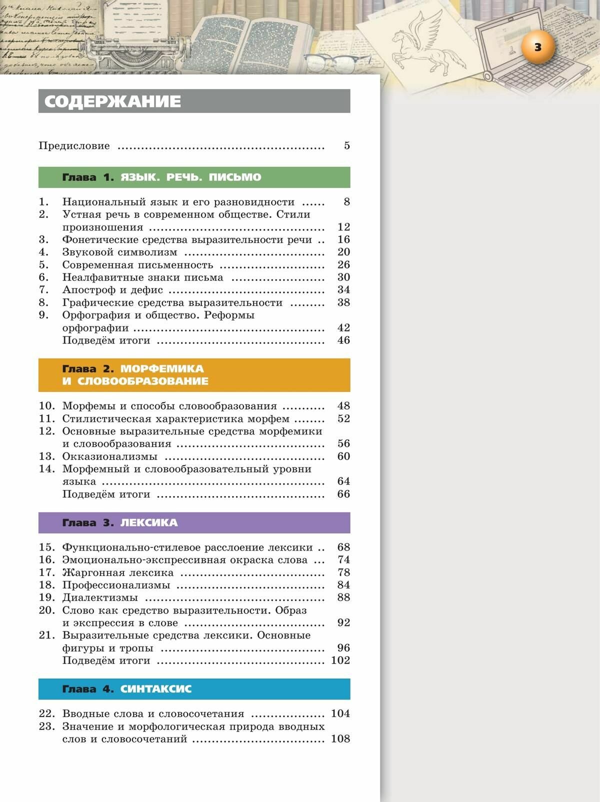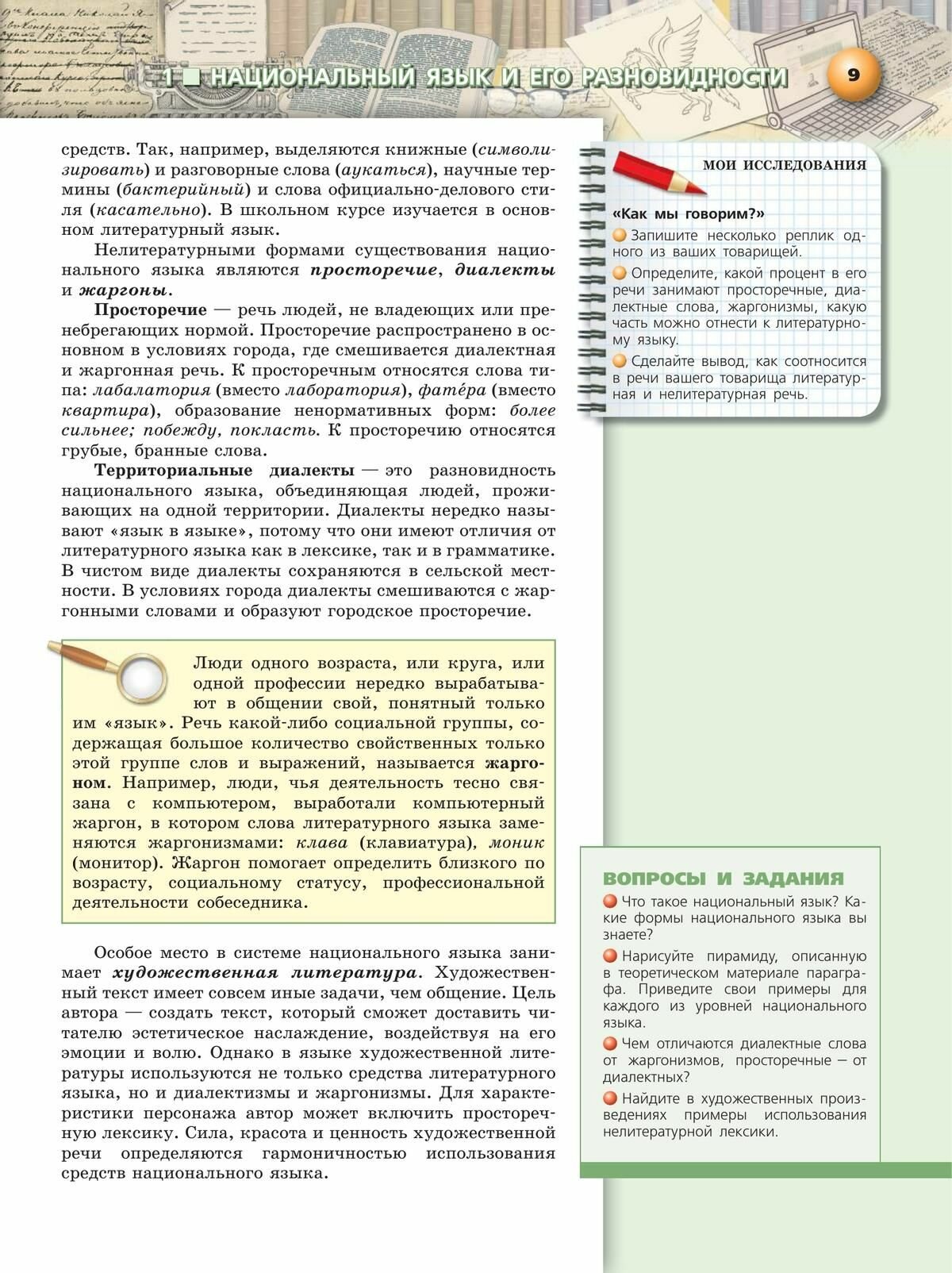 В центр изучения в девятом классе авторы ставят тему «Язык и общество», сделав упор на практическое использование знаний и умений в различных речевых ситуациях. Центральная тема в пособии последовательно рассматривается с точки зрения фонетики, графики, морфемики, словообразования, лексики, синтаксиса и культуры письменной и устной речи. Материал каждого параграфа разбит на две части — теорию и практику. В раздел теории включены определения необходимых понятий, правила, сведения о выдающихся лингвистах и языковых явлениях, популярное изложение лингвистических теорий. Особенность представленного пособия — отказ от безапелляционного утверждения того или иного подхода к языковым фактам. Обо всём, что может быть дано не как аксиома, а как проблема, предлагается поразмышлять. Разумеется, и запоминать правила, и переписывать тексты, вставляя пропущенные буквы и знаки препинания, тоже придётся, ведь без труда учения не бывает.