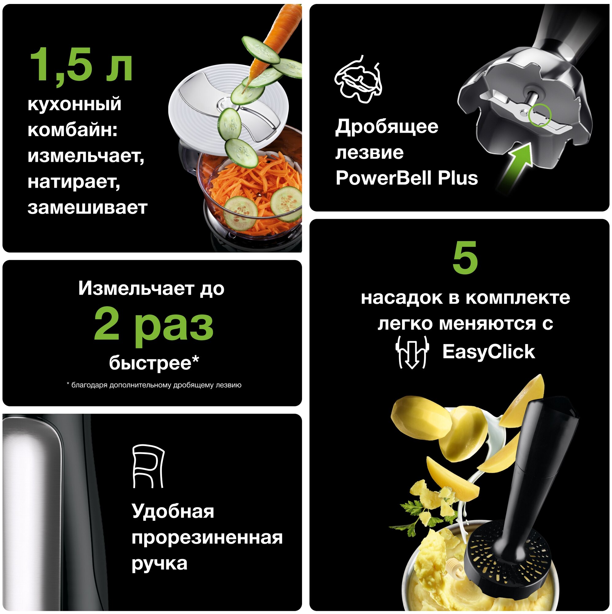 | Насадки в комплекте | Измельчитель (350 мл), Насадка венчик для взбивания, Насадка ручной блендер, Мерный стакан (600 мл), Кухонный комбайн, Нож для измельчения, Терка крупная , Терка мелкая, Шинковка крупная, Насадка для картофеля-фри, Насадка для густого теста, Насадка для приготовления пюре |