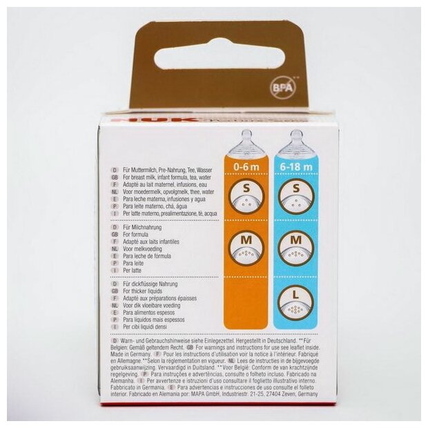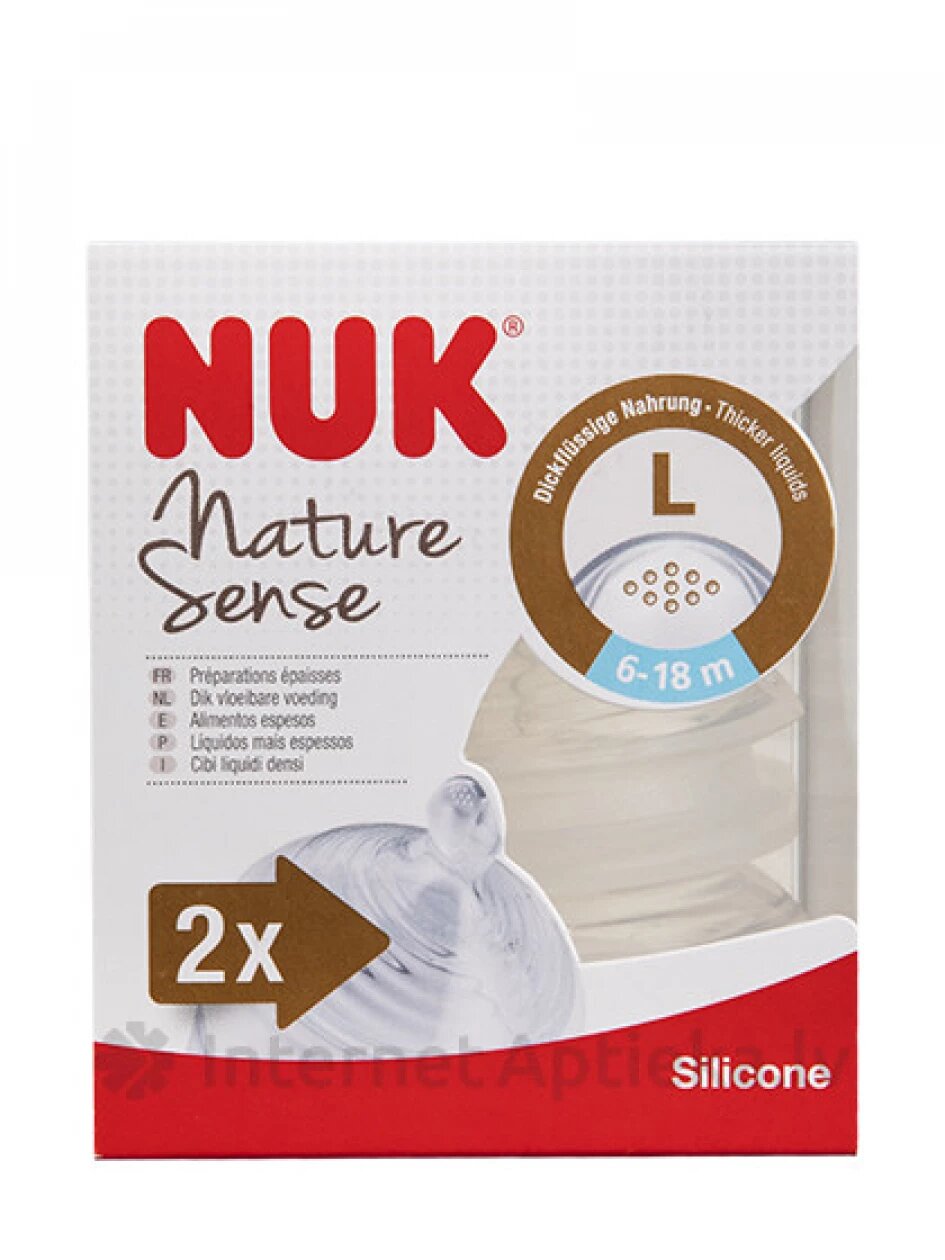 Nuk Nature Sense Соска из силикона 2L 2 шт. Особенности: не протекающие идеальны для прогулок и путешествий совместимы со всеми бутылочками Nuk Nature Sense Инновационная соска с более широким основанием обеспечивает ребенку естественный захват, а круговые рифления с внутренней стороны соски придают ей повышенную гибкость и подвижность Соска с очень мягким кончиком, на котором имеются несколько отверстий имитирующих естественный поток молока Новаторский клапан Anti-colic Air System дает возможность пить из бутылочки без перерыва и предотвращает заглатывание воздуха Размеры: 2 - для детей старше 6 мес. Отверстия: L - для жидких каш и заменителей с загустителями - 9 отверстий Состав: силикон Упаковка: 2 шт.