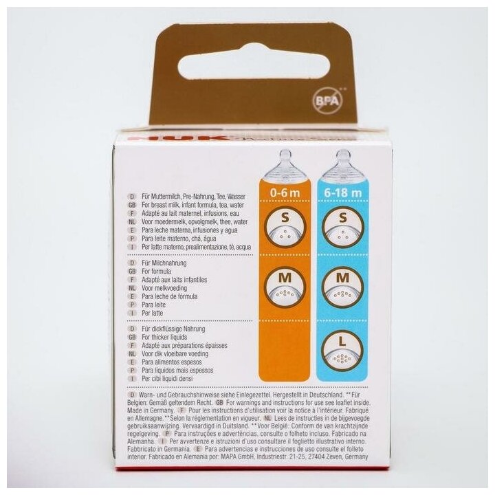 Nuk Nature Sense Соска из силикона 2M 2 шт. Особенности: не протекающие идеальны для прогулок и путешествий совместимы со всеми бутылочками Nuk Nature Sense Инновационная соска с более широким основанием обеспечивает ребенку естественный захват, а круговые рифления с внутренней стороны соски придают ей повышенную гибкость и подвижность Соска с очень мягким кончиком, на котором имеются несколько отверстий имитирующих естественный поток молока Новаторский клапан Anti-colic Air System дает возможность пить из бутылочки без перерыва и предотвращает заглатывание воздуха Размеры: 2 - для детей старше 6 мес. Отверстия: M - для заменителей грудного молока - 6 отверстий Состав: силикон Упаковка: 2 шт.