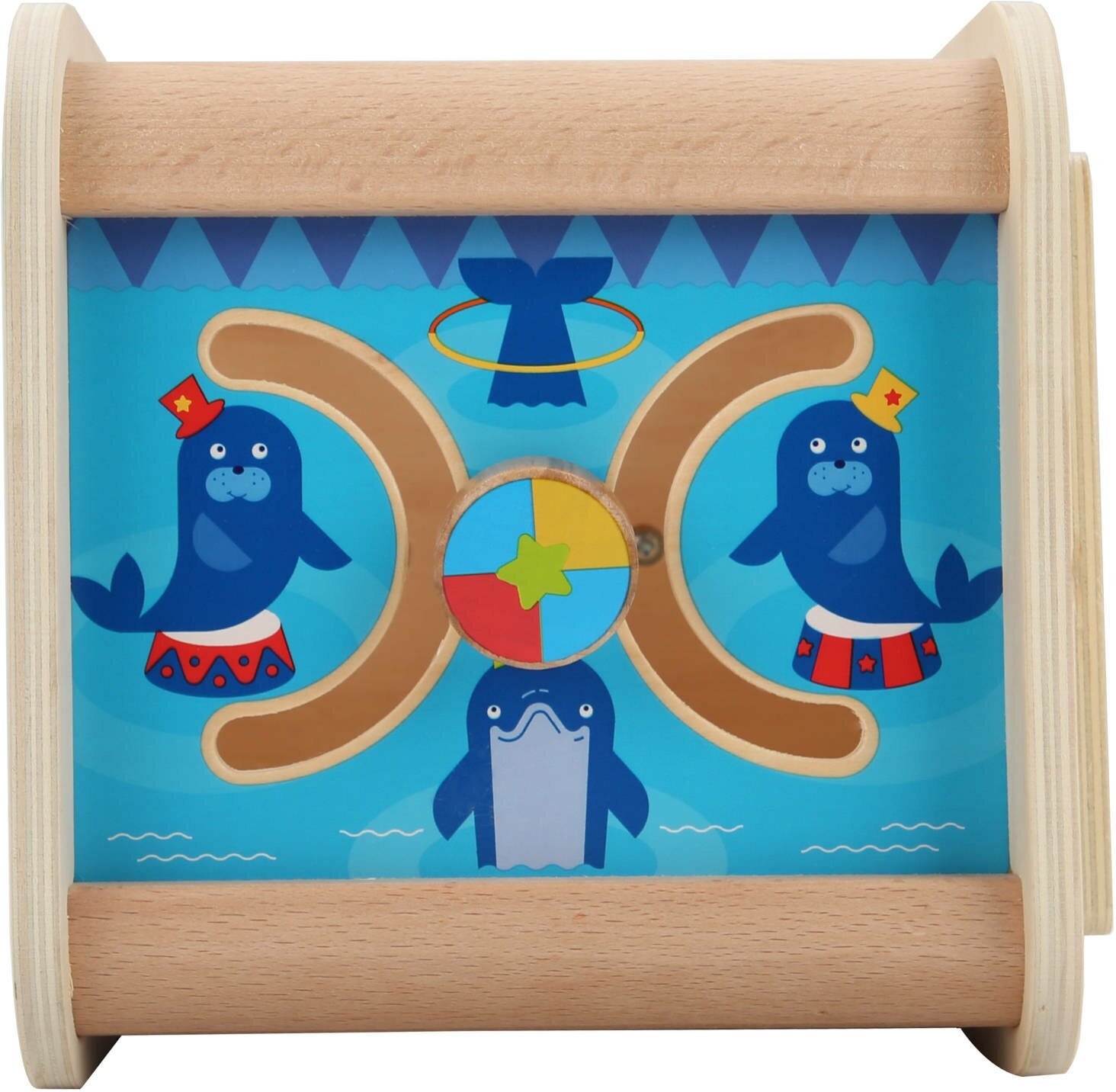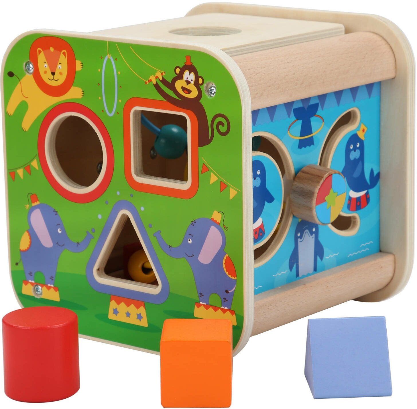 Универсальный деревянный куб «Цирк» состоит из нескольких развивающих и обучающих элементов: красочный лабиринт, в котором можно изучать разные направления; часы со стрелками для изучения времени; сортер для усваивания геометрических фигур и дверцы со спрятанным ярким рисунком.