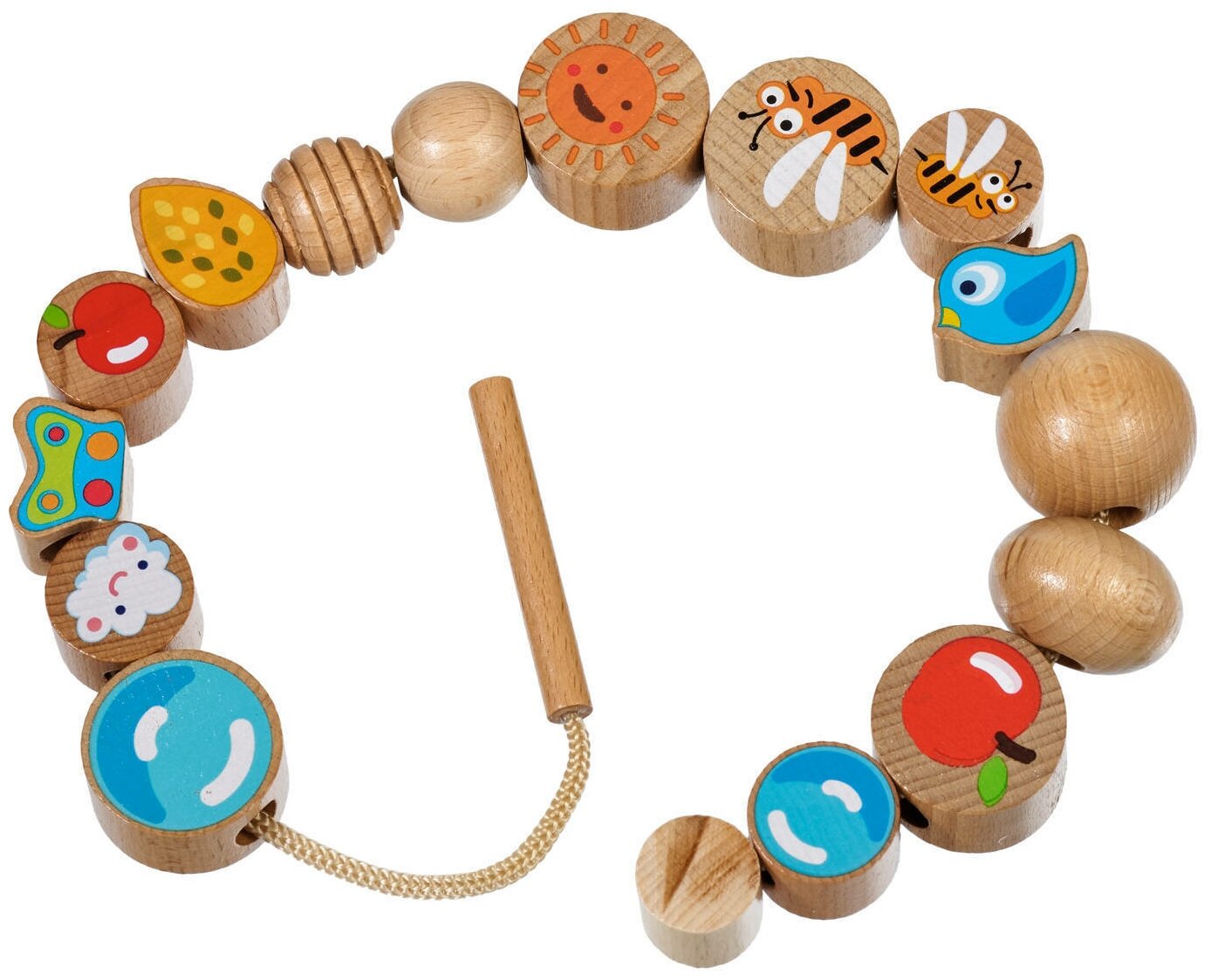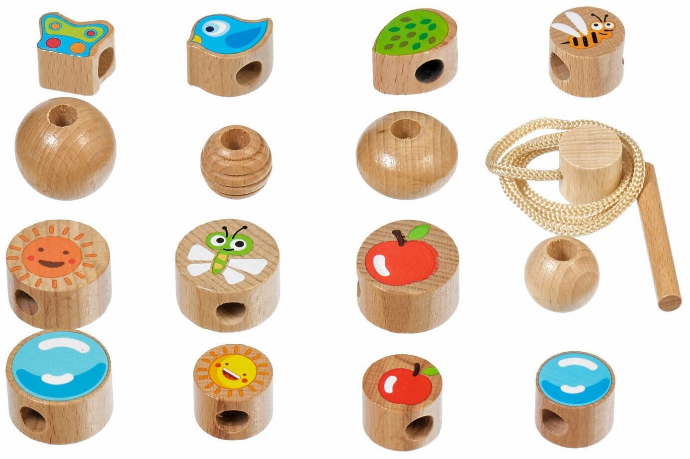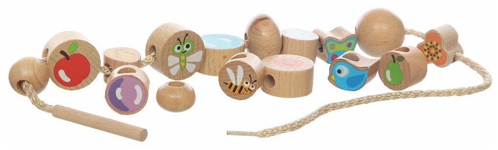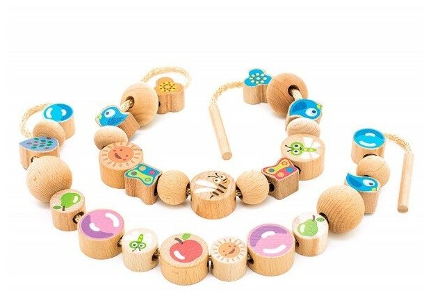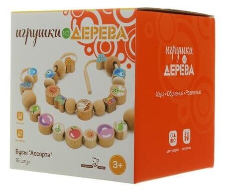 Бусы «Ассорти» станут отличным развлечением для Вашего ребенка! Игрушка состоит из шнурка и 16 объемных деревянных бусин. Малышу предлагается надеть все фигурки на шнурок, который оснащен специальным наконечником для удобства. Играя с бусами, ребенок развивает мелкую моторику и знакомится с различными формами. Детали выполнены из настоящей древесины, хорошо обработаны и отшлифованы, поэтому абсолютно безопасны для детей. Фигурки покрыты нетоксичной краской на натуральной водной основе.