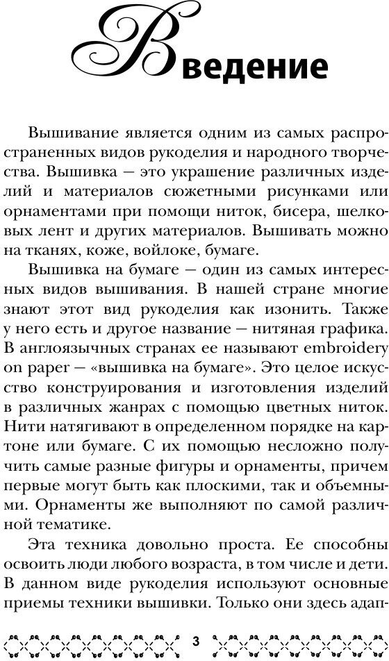 Вышивка по бумаге, нитяная графика, изонить - все это названия одного и того же вида рукоделия, описанного в данной книге. Из нее вы узнаете, как правильно выбрать бумагу и картон для вышивания, какова технология работы. Вашему вниманию будут представлены изделия, выполненные в данной технике, с подробными их описаниями и рисунками.