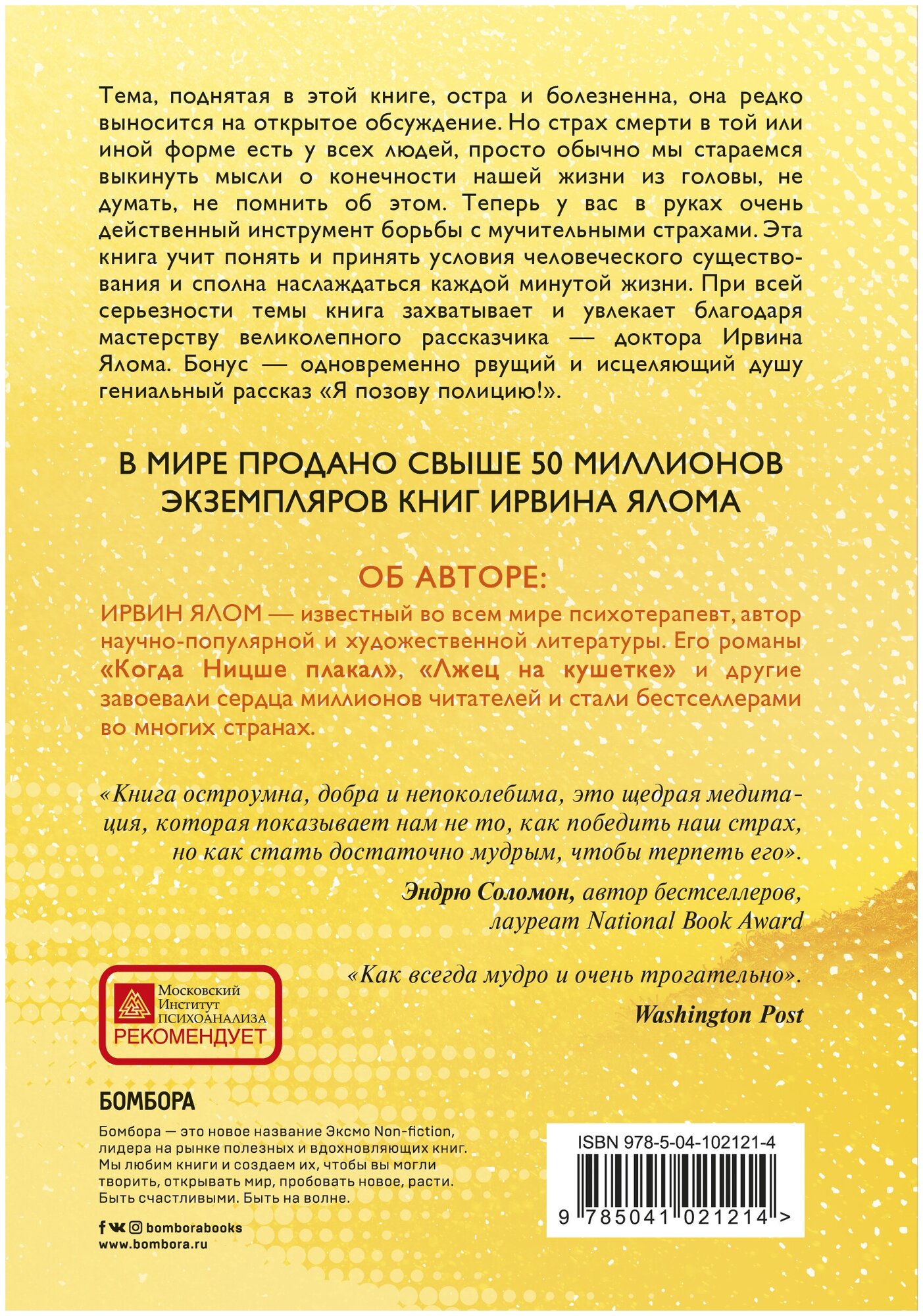 Новое издание бестселлера известного американского психотерапевта и писателя Ирвина Ялома. Тема, поднятая в этой книге, остра и болезненна, она редко выносится на открытое обсуждение. Но страх смерти в той или иной форме есть у всех людей, просто обычно мы стараемся выкинуть мысли о конечности нашей жизни из головы, не думать, не помнить об этом. Теперь у вас в руках очень действенный инструмент борьбы с мучительными страхами. Эта книга учит понять и принять условия человеческого существования и сполна наслаждаться каждой минутой жизни. При всей серьезности темы книга захватывает и увлекает благодаря мастерству великолепного рассказчика - доктора Ирвина Ялома. Бонус - одновременно рвущий и исцеляющий душу гениальный рассказ "Я позову полицию!".