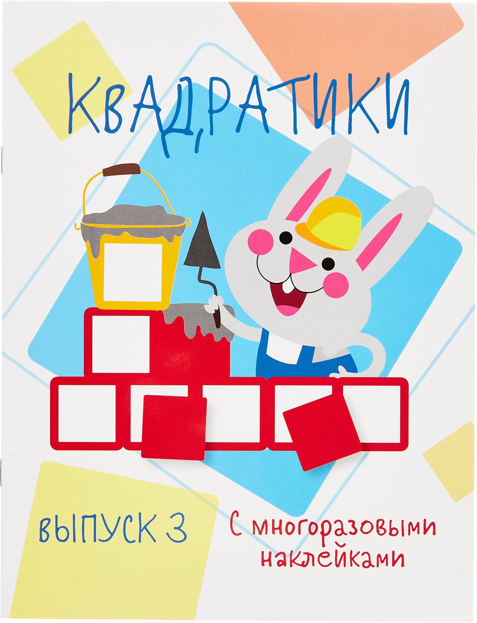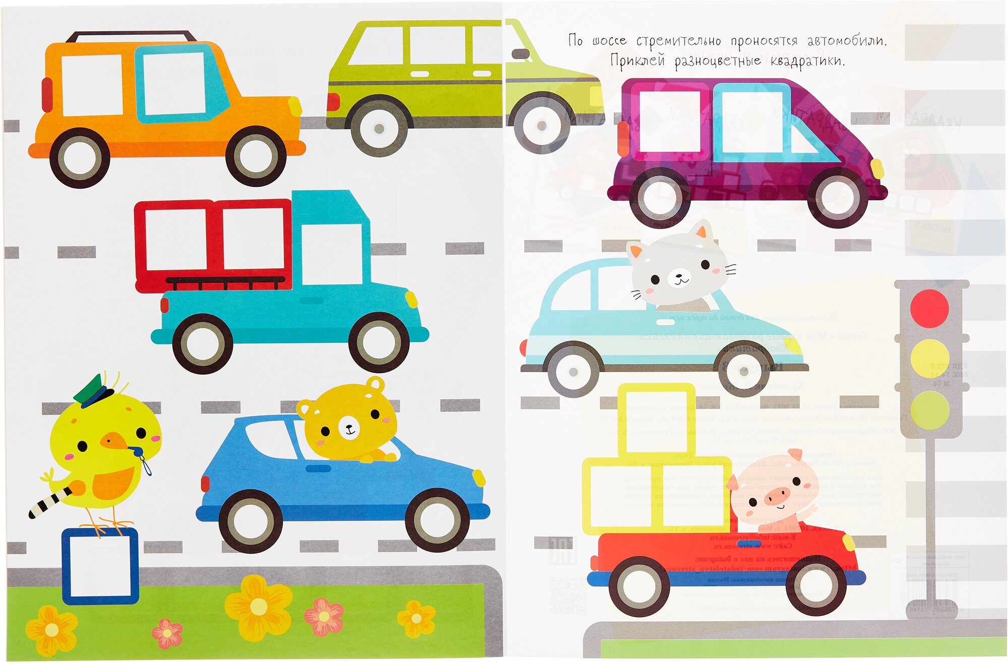 В этой книге 70 наклеек - разноцветных квадратиков. Малыш должен дополнит с их помощью картинки. Это очень просто: покажите ему, что наклейку нужно приклеит в квадратный контур. Если с первой попытки приклеит" ровно не получилось - не беда, ведь наши наклейки многоразовые.