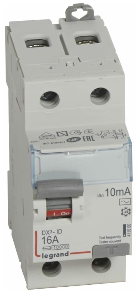 Выключатель дифференциального тока (УЗО) 2п 16А 10мА тип AC DX3 Leg 411500Устройство защитного отключения рассчитано в основном для работы в бытовых электрических сетях максимально допустимым током 16 Ампер. В такую сеть не желательно включать несколько энергоёмких приборов бытовой электроники. Как и в других устройствах подобного типа, принципом работы является электромагнитное размыкание контактов на основе оценки дифференциальных токов проходящих в сети. Рассчитанное на ток утечки величиной в 10мА, устройство защиты обладает повышенной чувствительностью к ложным срабатываниям. Эта особенность не является его недостатком, так как речь идет об отключении сети бытового назначения и защиты пользователей от непроизвольного прикосновения к элементам электроприборов, находящихся под напряжением. Устройство защиты срабатывает на синусоидальный переменный ток. На это указывает маркировка: принадлежность его к типу А. Все элементы устройства размещены в стандартном корпусе, что позволяет крепить его к DIN линейке.