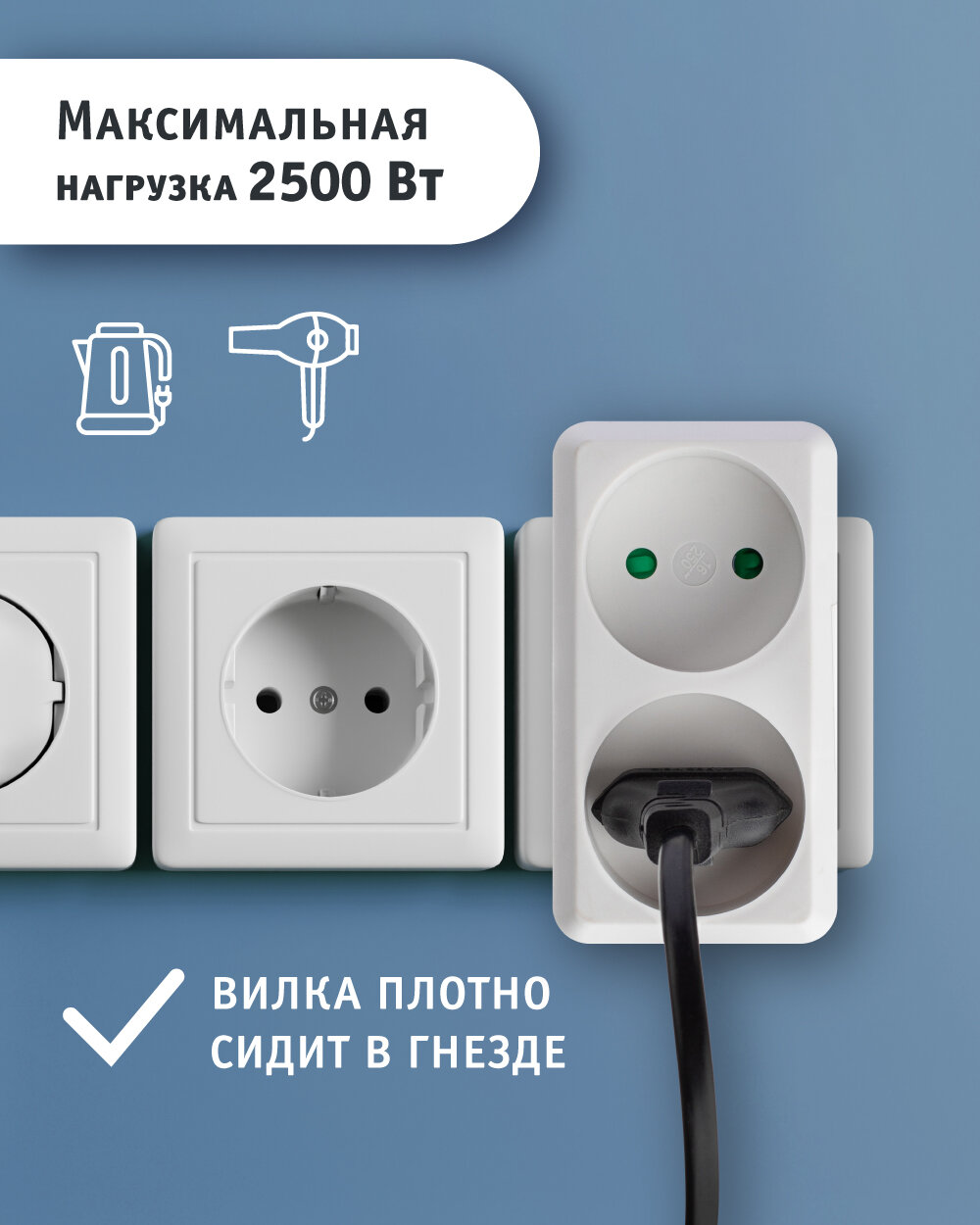 Сетевой разветвитель изготовлен из негорючего ударопрочного и негорючего ABS пластика, что обеспечивает долгий срок службы и гарантирует надежность в использовании. Цвет переходника для розетки —белый, что позволяет ему гармонично вписаться в любой интерьер. Разветвитель подходит для приборов с вилкой российского и евростандарта. Максимальная мощность всех подключаемых приборов – 2500 Вт. Двойник для розетки оснащен специальными защитными шторками. Тройники и разветвители Navigator сертифицированы, выполнены из безопасных качественных материалов и соответствуют всем нормам и требованиям безопасности.