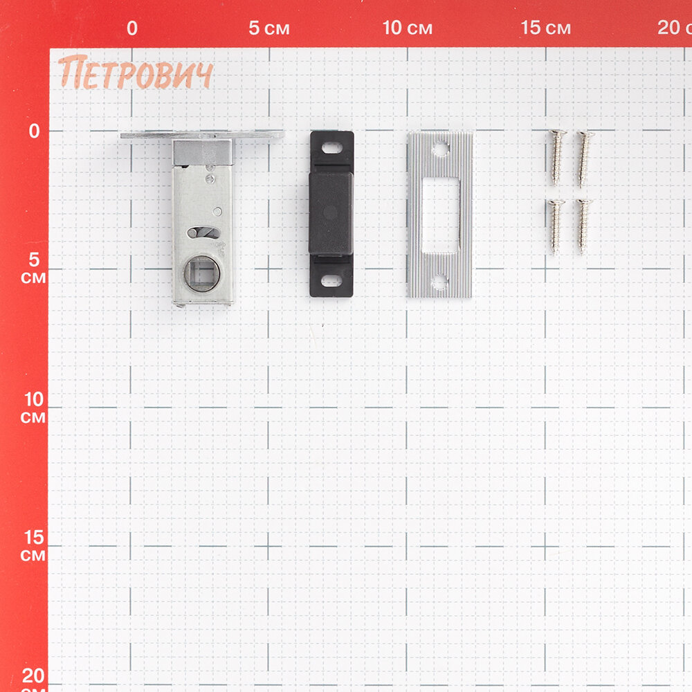 Защелка межкомнатная серии 100 M. Механизм оснащен магнитным пластиковым язычком обеспечивающим мягкое открывание и закрывание двери. Гарантированное количество циклов безотказной работы узлов защелки более 150000. Качество гальванического покрытия подтверждено тестом на устойчивость в камере соляного тумана - более 96 часов. В комплекте поставки: защелка магнитная ответная планка пластиковая вставка под ответную планку шурупы Тип защелки: универсальная (правая/левая) Цвет: матовый хром Упаковка: блистер