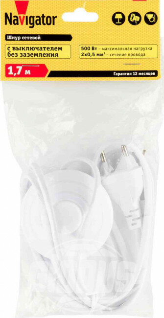Шнур Navigator 94 667 NPS-FS-170-2x0.75-WH 1.7м с выкл. белый цена за 1 шт.