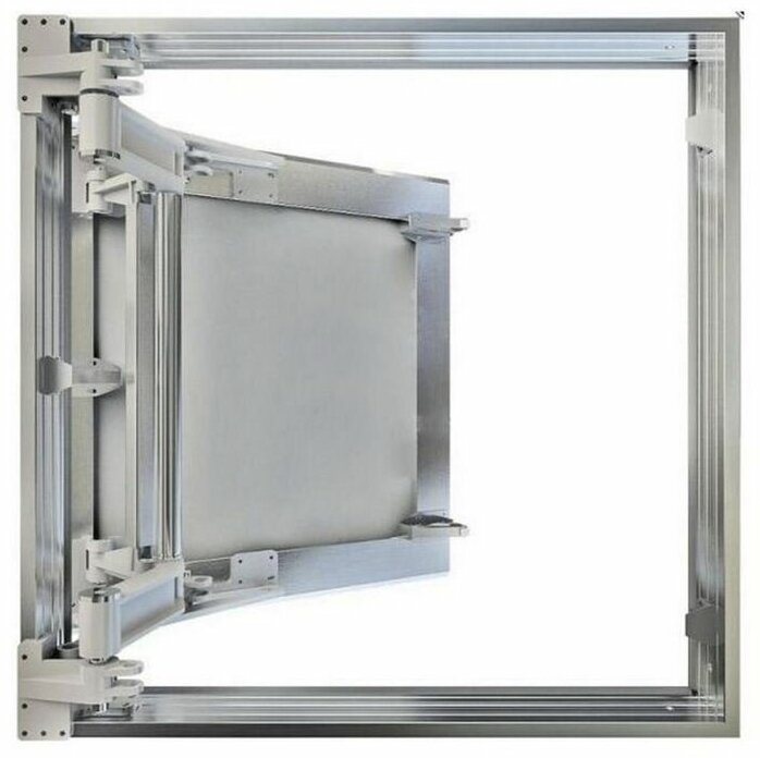 Алюминиевый люк премиум-класса под отделку плиткой. Размеры по внешней стороне рамы: 600 мм (ширина) х 600 мм (высота), размеры дверцы: 562 мм (ширина) х 562 мм (высота). Обеспечивает скрытый доступ к сантехническим коммуникациям. Открывается нажатием. Направляющие в петле предотвращают скол плитки. Силиконовый уплотнитель защищает от влаги и неприятных запахов. Со стороны петли от края плитки на дверце до соседней стены должно быть не менее 60 мм.