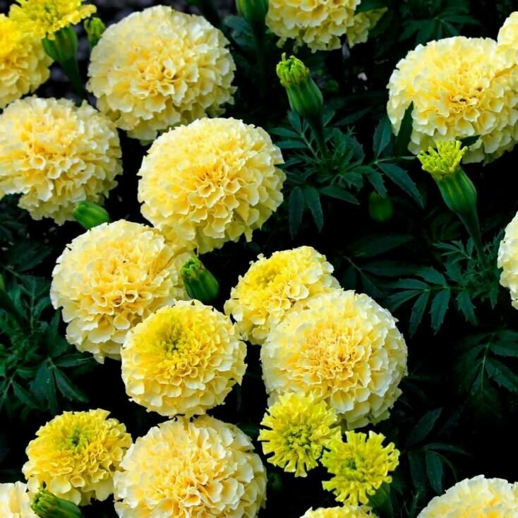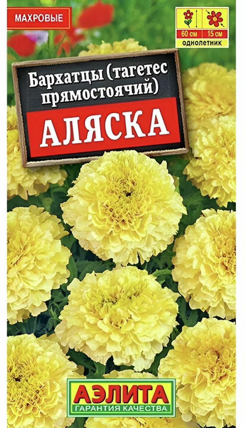 Бархатцы АЛЯСКА очень популярны у цветоводов из-за эффектной окраски и впечатляющих размеров густомахровых соцветий ( 13-15 см). Сорт формирует хорошо разветвленные кусты высотой 50-60 см. Растения крепкие, хорошо облиственные, отлично смотрятся моногруппой и в смешанных цветниках в среднем ярусе. Легко переносят воздействие дождя и ветра, неприхотливые. Отлично подходят для срезки, сохраняя в воде свежесть и красоту до 15 дней.