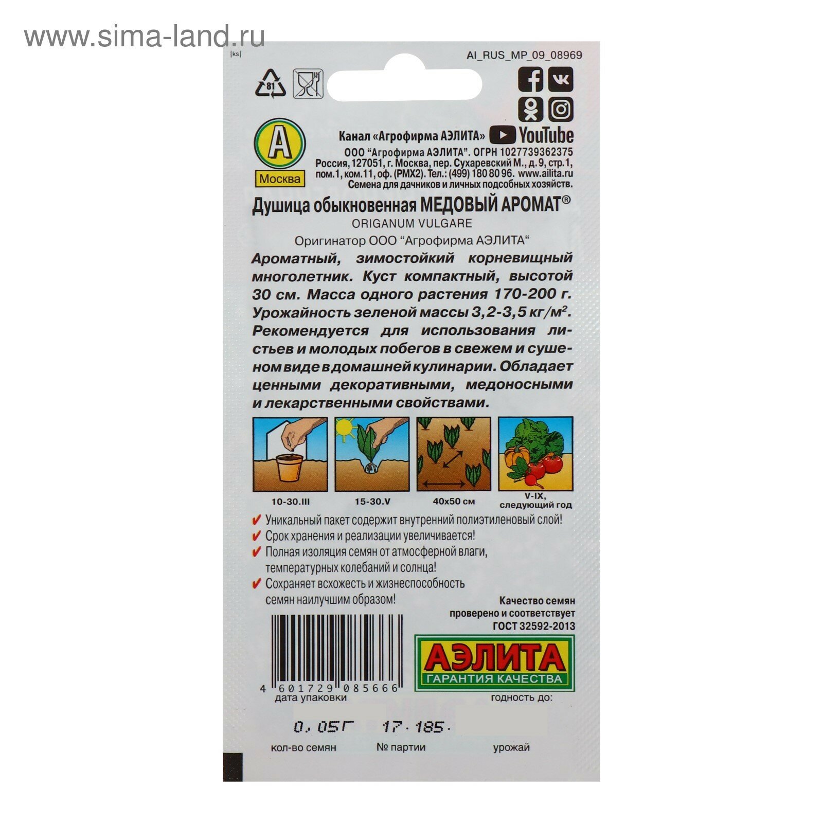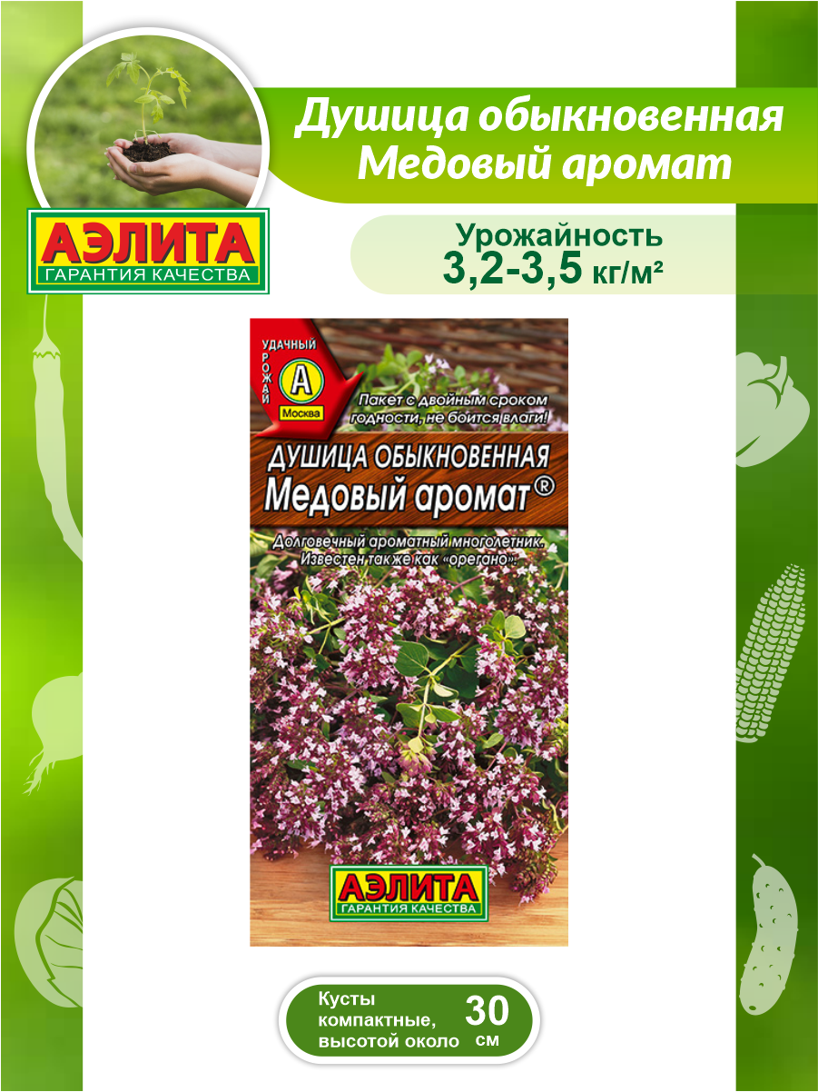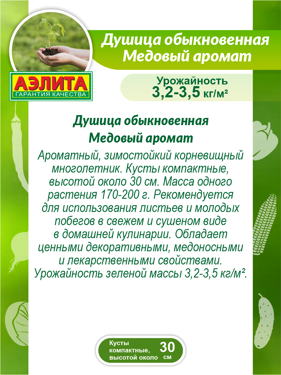 Многолетнее растение высотой 30 см. Масса одного растения 170-200 г. Урожайность зеленой массы 3,2-3,5 кг/м2. Ароматичность сильная. Рекомендуется для использования листьев и молодых побегов в свежем и сушеном виде, в качестве приправы к овощным, картофельным, мясным блюдам, при консервировании, для приготовления напитков. Широко используется в домашней выпечке, при приготовлении мармеладов, сиропов, желе. Само название растения – душица – и обилие благозвучных синонимов – духовой цвет, пчелолюб, ладанка, материнка, лесная мята – указывает на необыкновенную популярность в народе. Душица признана официальной медициной, ее трава оказывает успокаивающее действие, улучшает сон, нормализует работу кишечника, исключительно полезна женщинам после 40 и детям при аллергических реакциях. От нас - для вашего стола, здоровья и удовольствия.