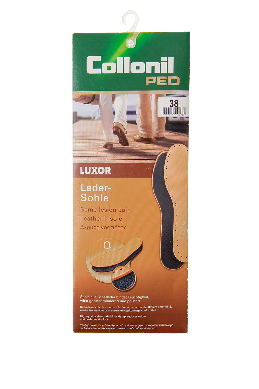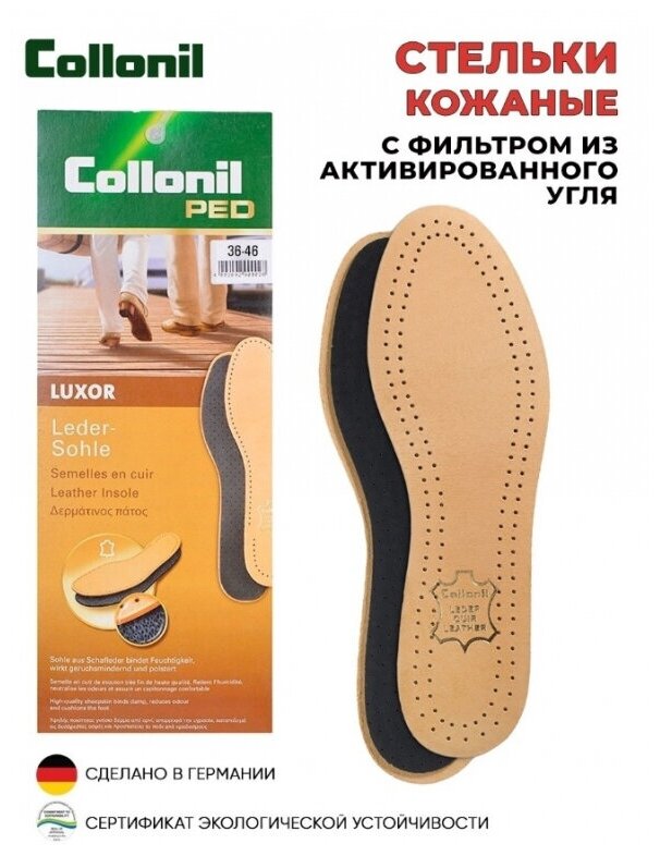 Стельки для обуви Collonil Luxor - стельки из натуральной кожи, с основой из латекса и фильтром из активированного угля. Прекрасно впитывают влагу и нейтрализуют неприятные запахи. Дополнительная перфорация обеспечивает лучшую циркуляцию воздуха. Стельки обеспечивает мягкость и комфорт при ходьбе, дарят приятное ощущение сухости ног в обуви.