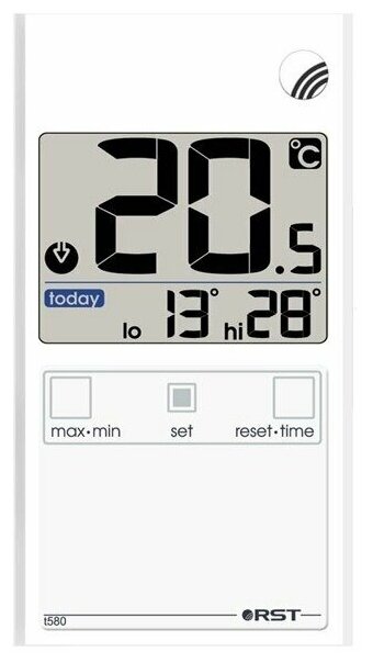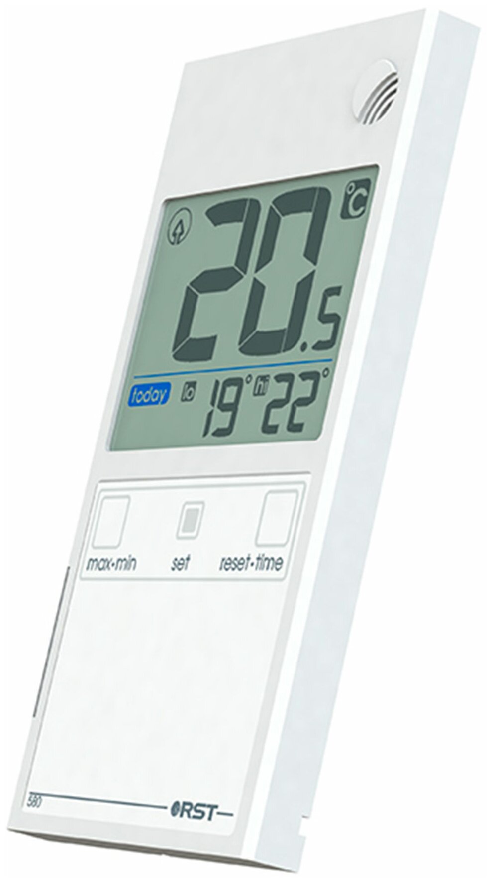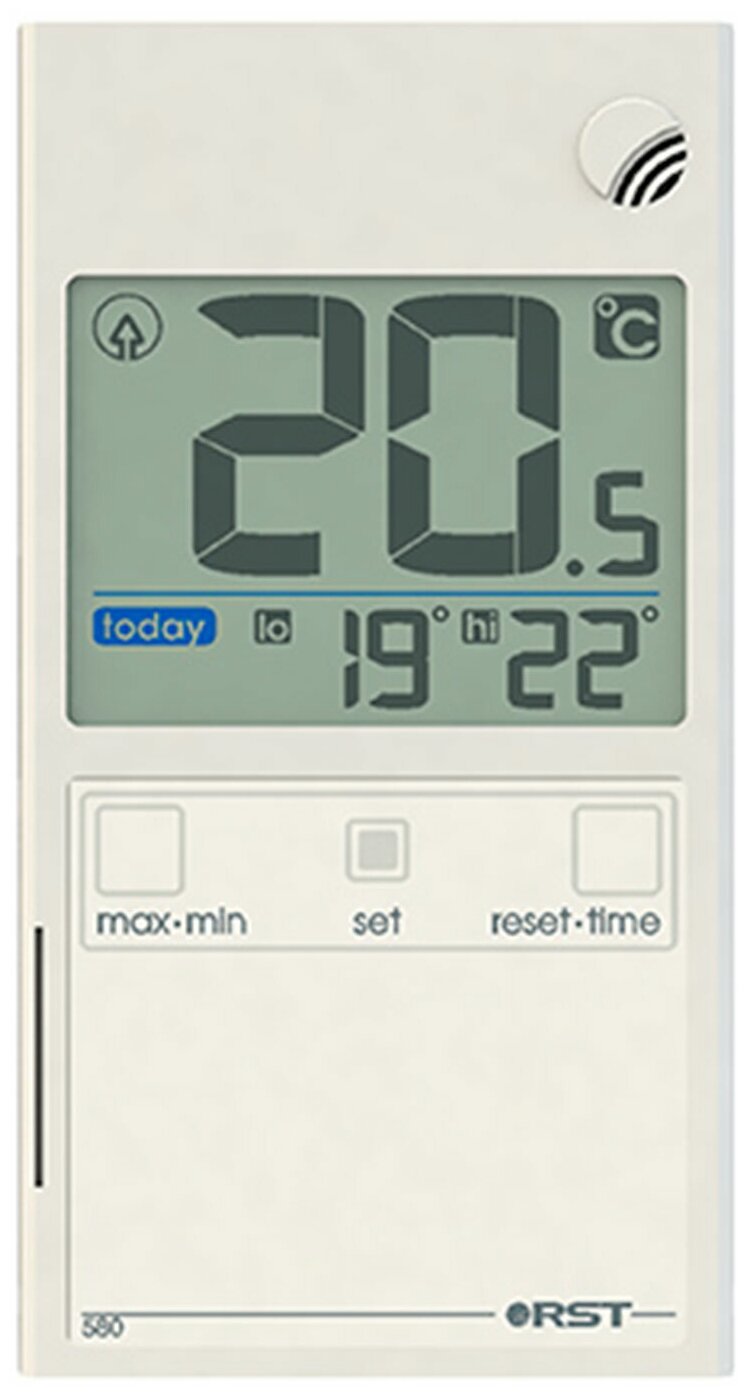 Комнатный термометр RST 1580 отображает температуру воздуха в диапазоне от -20 до +70 °С. Удобное крепление на двусторонний скотч избавляет от необходимости сверлить дыры в стенах. В памяти прибора сохраняется минимальное и максимальное значение температуры за последние сутки и отображается на дисплее, в нижней строке. Сенсорные кнопки позволяют настроить текущее время, и в в любой момент переключать градусник в режим часов.