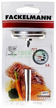 Термометр для мяса FACKELMANN 63801 используется для того, чтобы измерить внутреннюю температуру мяса во время приготовления его в духовке. Измеряет температуру от 0 до 120 градусов. Подходит для использования в газовых, электрических и горячевоздушных плитах. Разрешено мыть в посудомоечной машине.