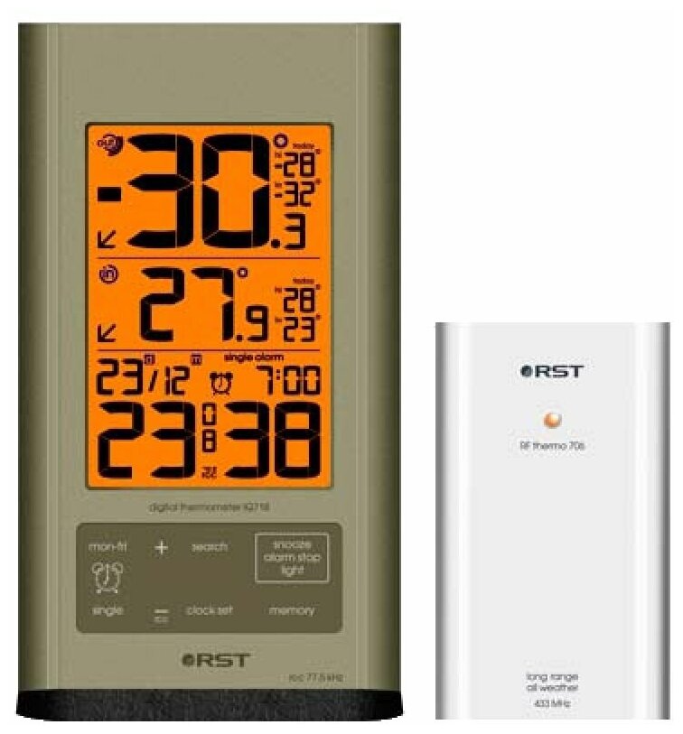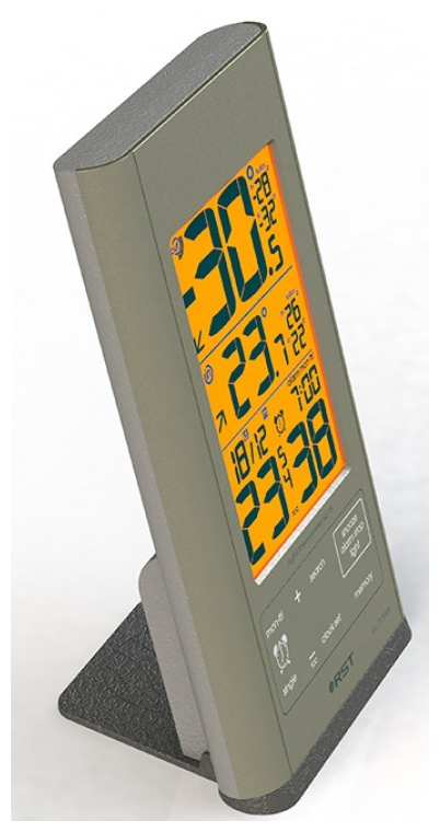 RST 02718 - это точная температура воздуха в помещении и на улице, тенденция изменения температур, память максимального и минимального значений температур, индикатор наступления гололеда и заморозков. Календарь с указанием номера недели, система разумный будильник. Яркая мягкая подсветка дисплея. Устанавливается на столе и имеет настенный крепеж.