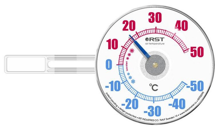 Очень интересный термометр - RST 02095. Он работает, используя свойство биметаллической пружинки сворачиваться-раскручиваться при изменении температуры. Среди бытовых термометров такие встречаются довольно редко. Как правило, их используют для измерения параметров в промышленных цехах, на производствах, а также в системах кондиционирования, теплоснабжения, водоснабжения. Часто подобные приборы применяют для измерения температуры в стационарных промышленных установках. Но в данном случае, мы видим прекрасный пример адаптации промышленных технологий для нужд конкретного человека. Особенно удобно крепление: простая липучка клеится прямо на стекло и держится очень крепко, несмотря на дождь и ветер.
