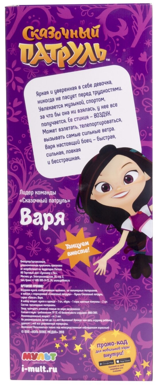 Кукла Сказочный патруль серия Dance Варя. Волшебницы Сказочного патруля наделены множеством талантов. Вот и Варя не только подчиняет себе ветер и владеет телепортацией, но и отлично танцует. Все вместе, с Машей, Снежкой и Аленой, они составляют замечательную танцевальную команду.