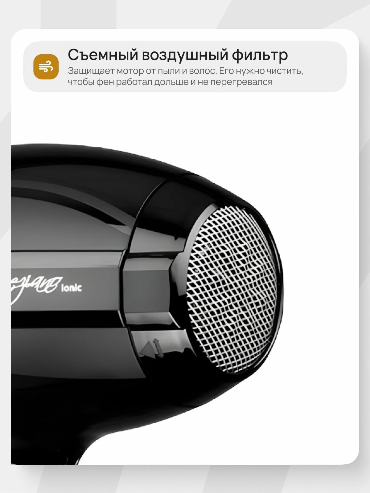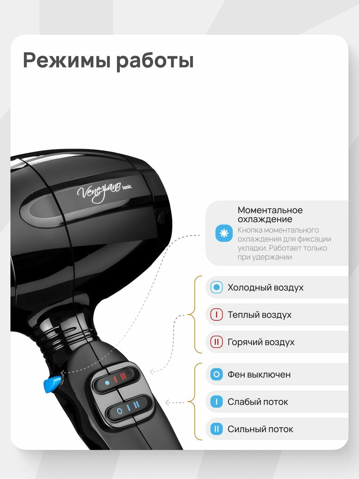 BaByliss Veneziano Ionic – профессиональный фен BaByliss PRO, каждая деталь которого имеет исключительно итальянское происхождение. Фен оснащён надёжным и мотором переменного тока (АС), который обеспечивает скорость воздушного потока около 106 км/час. А для защиты здоровья и блеска волос предусмотрен встроенный генератор отрицательно заряженных ионов.