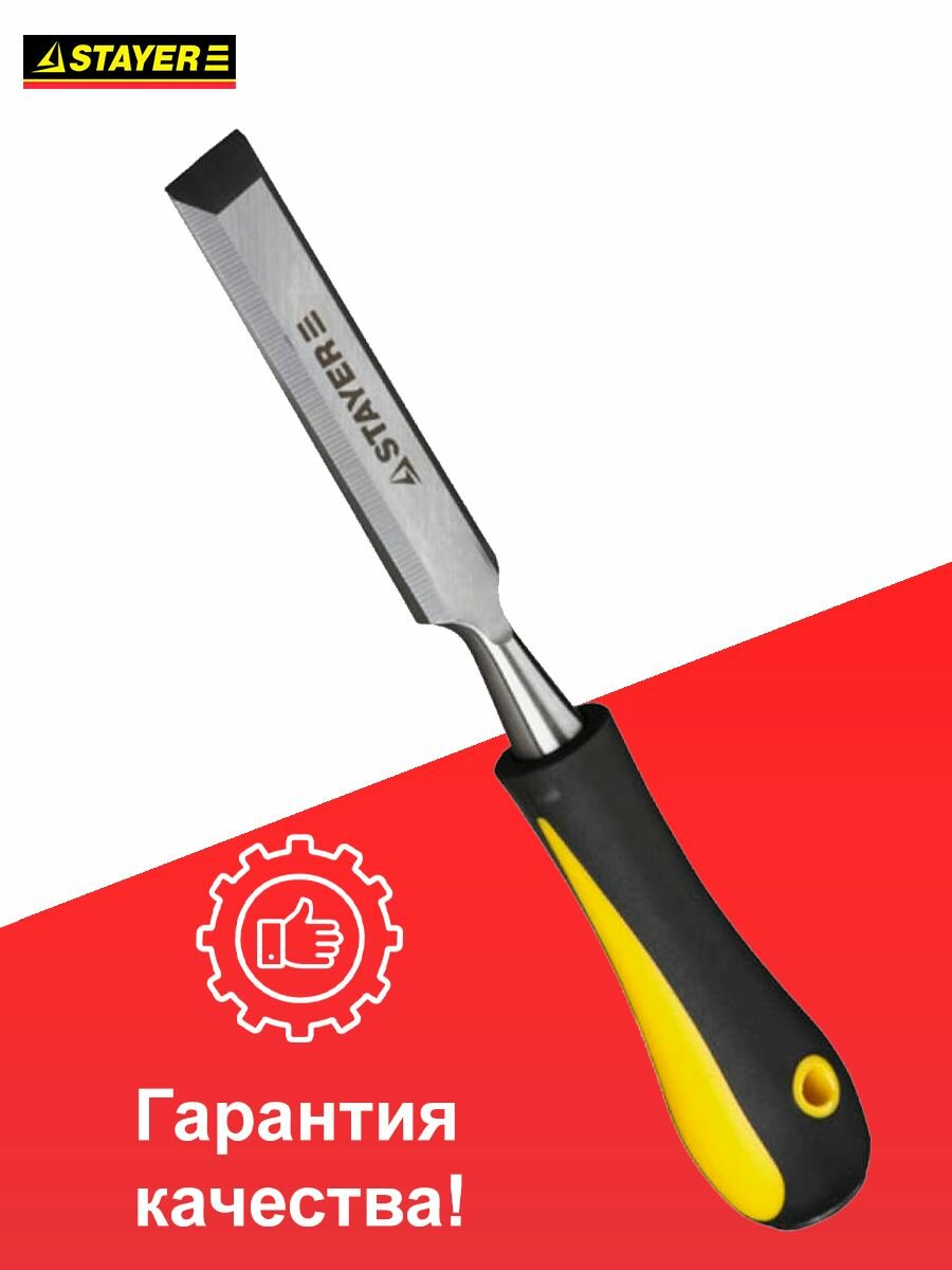 Стамеска STAYER "PROFI" – классический столярный инструмент с рукояткой из практичного материала. Для усиления ручки в торце установлен стальной затыльник, поэтому рукоятка выдерживает удары молотка. Дополнительно есть отверстие, за которое инструмент можно подвесить., Лезвие STAYER "PROFI" стальное, подходит для обработки большинства пород дерева. При хранении лезвие закрыто защитным колпачком.