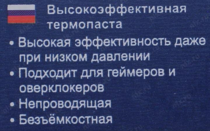 | Прочие особенности и свойства | Термопаста Arctic MX-2 состоит из микро-частиц углерода, которые обладают чрезвычайно высокой теплопроводностью. Это гарантирует, что тепло от центрального или графического процессора будет рассеяно быстро и эффективно. |