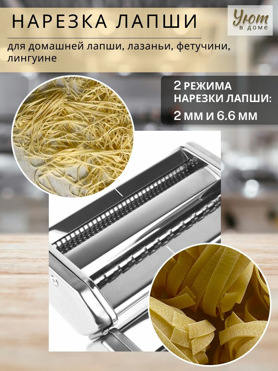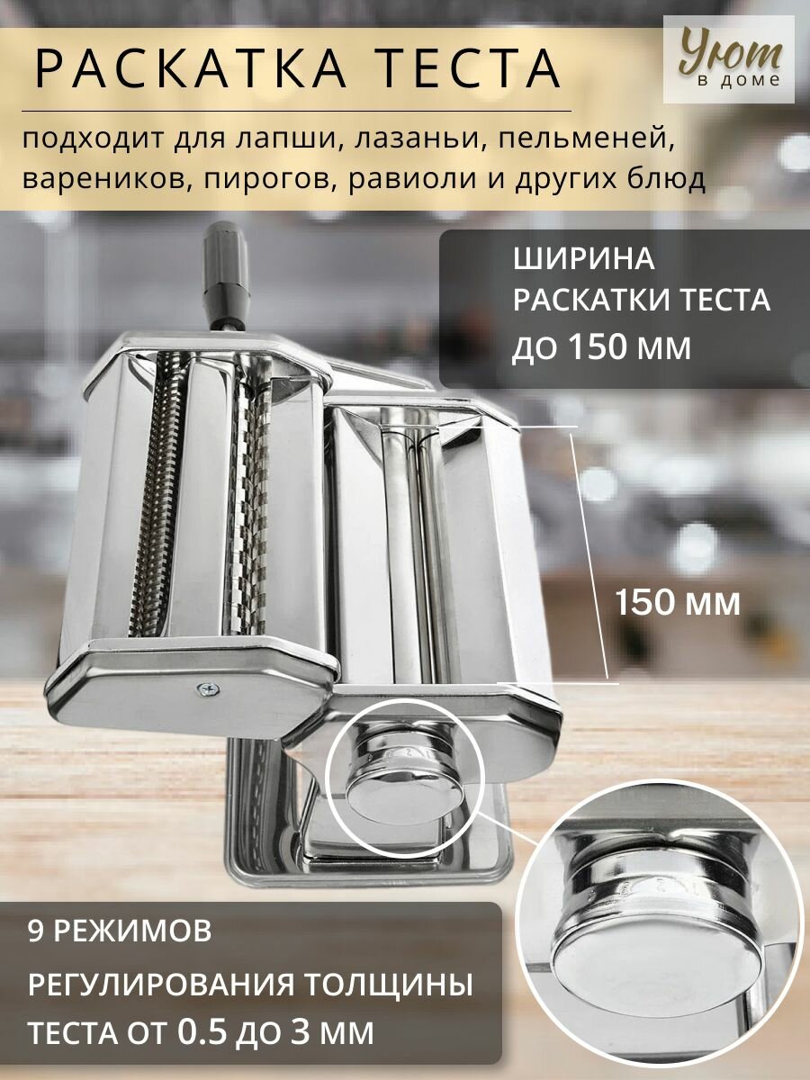 Прочие особенности и свойства | Специальные валики активизируются при вращении рукоятки — это позволяет раскатать тесто до тонкого пласта. Целых 9 режимов толщины (0,5-3 мм)! Режущие ролики разрезают раскатанное тесто на широкие или узкие полоски. Ширина плоской лапши — 6,6 мм, ширина спагетти — 2,2 мм. Ширина валика раскатки теста — 150 мм. |