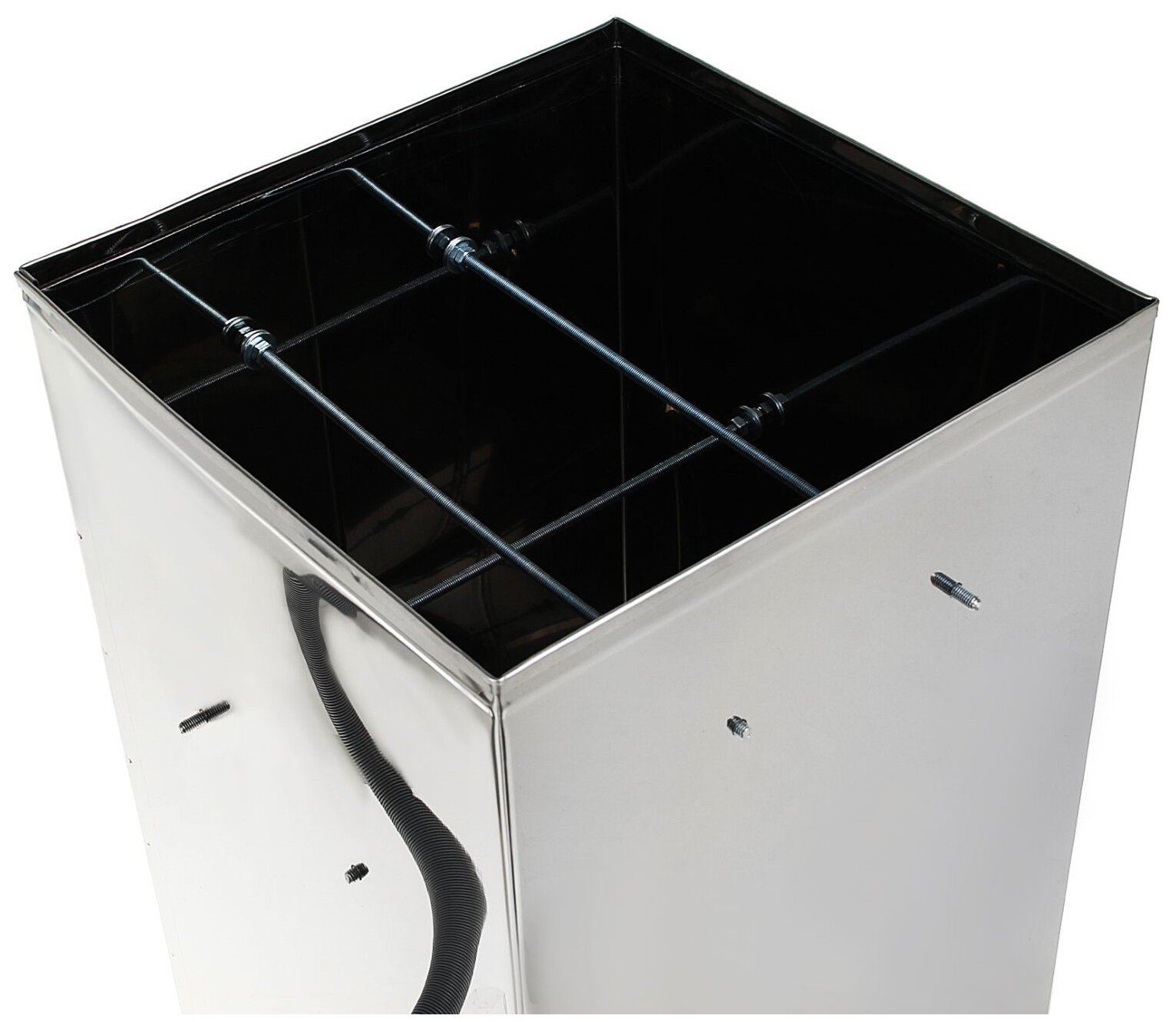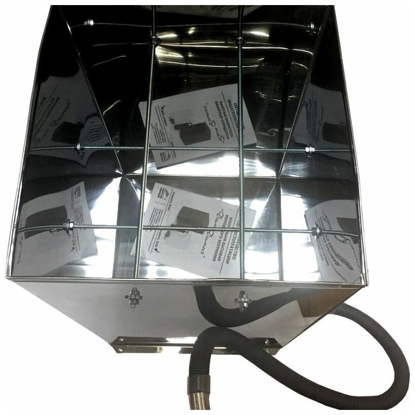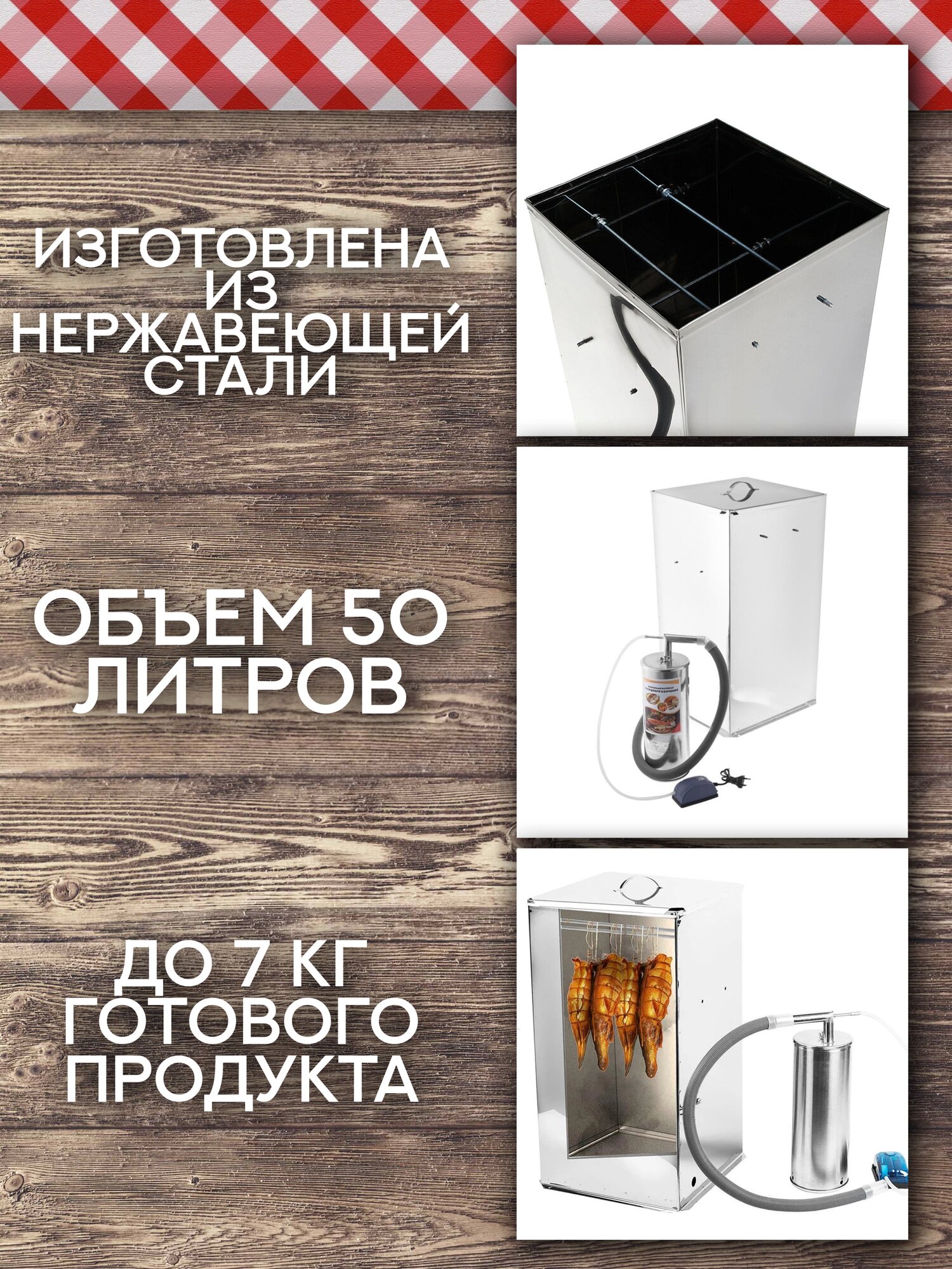Емкость для копчения имеет объем 50 литров. Есть дымогенератор и компрессор, при помощи которых дым по гофрированной трубке будет подаваться в коптильную камеру. Обработка продуктов осуществляется дымом с температурой от 19 до 40 °С. Корпус коптильни выполнен из нержавеющей стали.