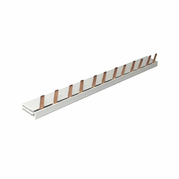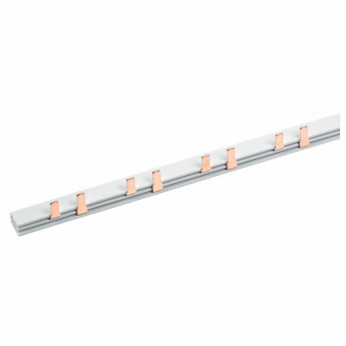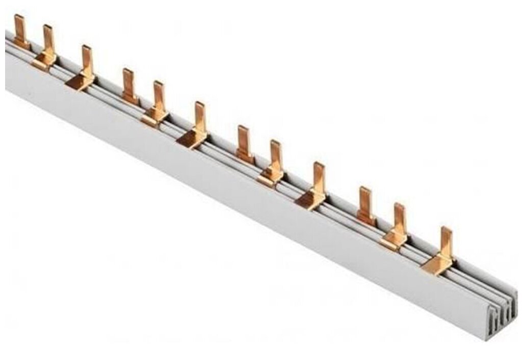 | Прочие особенности и свойства | Применяются для удобного и безопасного соединения групп:ВА (выключатели автоматические), АД (автоматы дифференциальные), ВД (выключатели дифференциальные), ВН (выключатели нагрузки). Шины с шагом 18 мм предназначены для коммутации аппаратуры шириной, кратной одному модулю, шины с шагом 27 мм предназначены для коммутации изделий шириной, кратной полутора модулям. Шины, рассчитанные на номинальный ток 100 А, могут быть использованы с номинальным током 125 А, если вводной автомат подключать по центру. Для полуторамодульных шин имеются боковые заглушки. Выполнены из медных пластин и помещены в пластиковый изолирующий корпус не поддерживающий горение. |