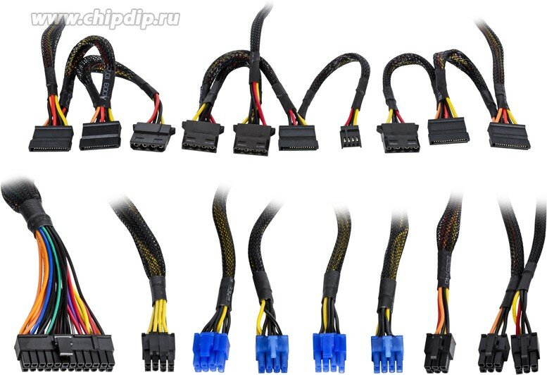 | Разъемы | MB 20+4 pin, CPU 2x(4+4) pin, питание видеокарты 6х(6+2) pin, SATA 8 шт, Molex 4 шт |