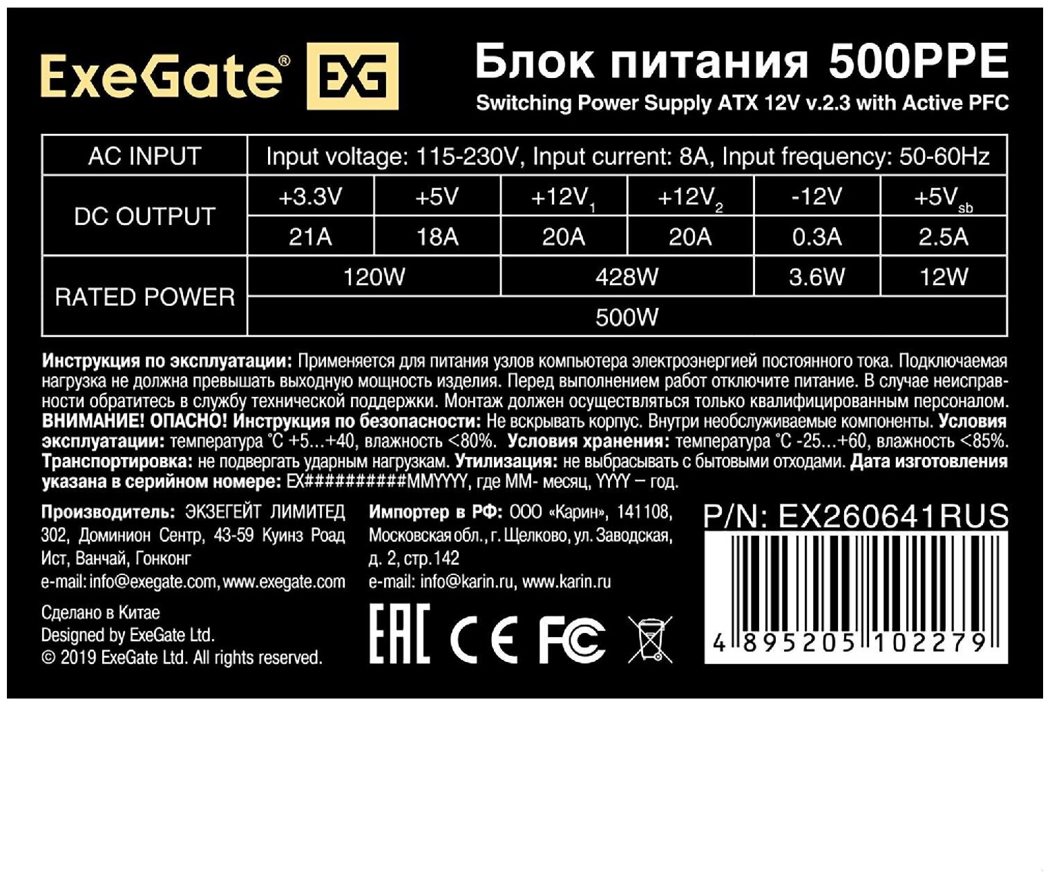 Блок питания ExeGate 500PPE 500W с защитой от выдергивания черный