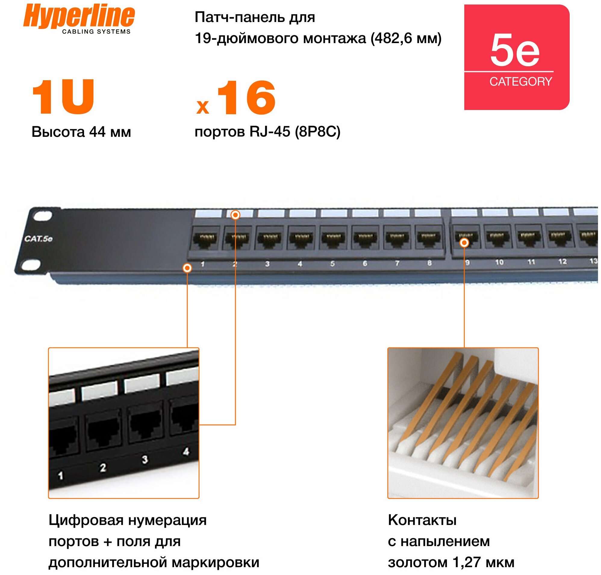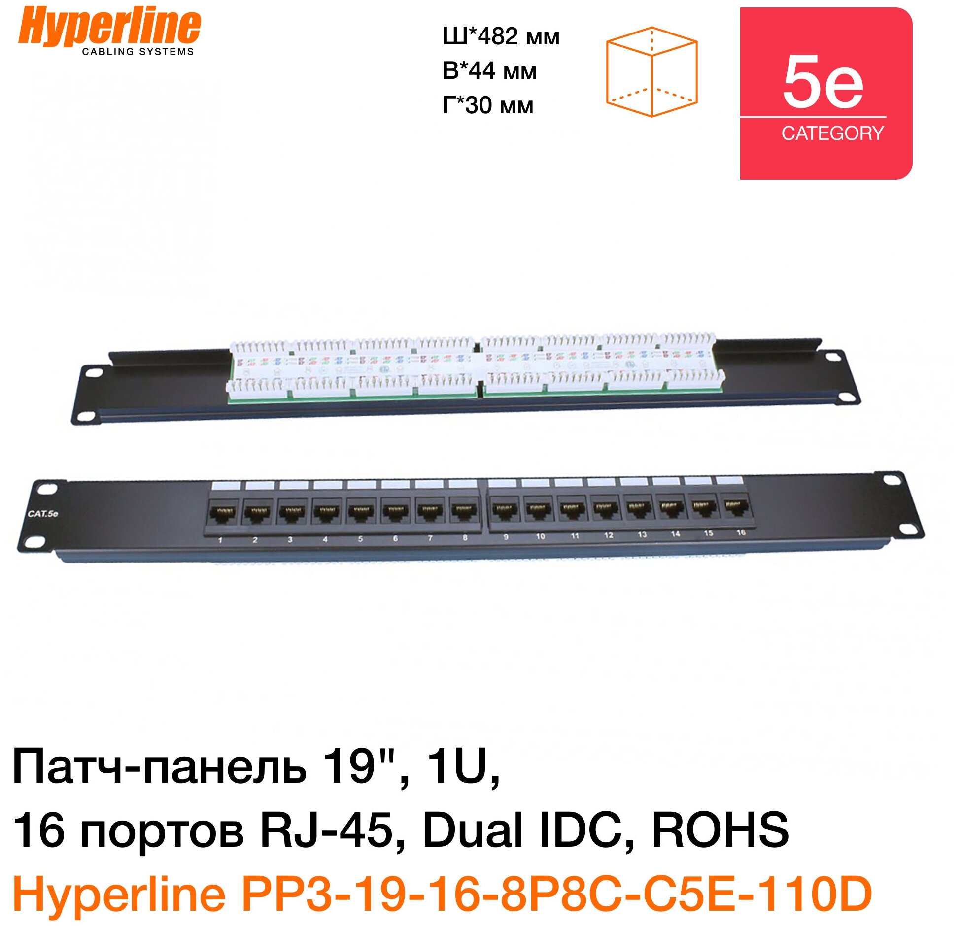 Патч-панель Hyperline 19" 1U 16 портов RJ-45 категория 5e Dual IDC ROHS черн