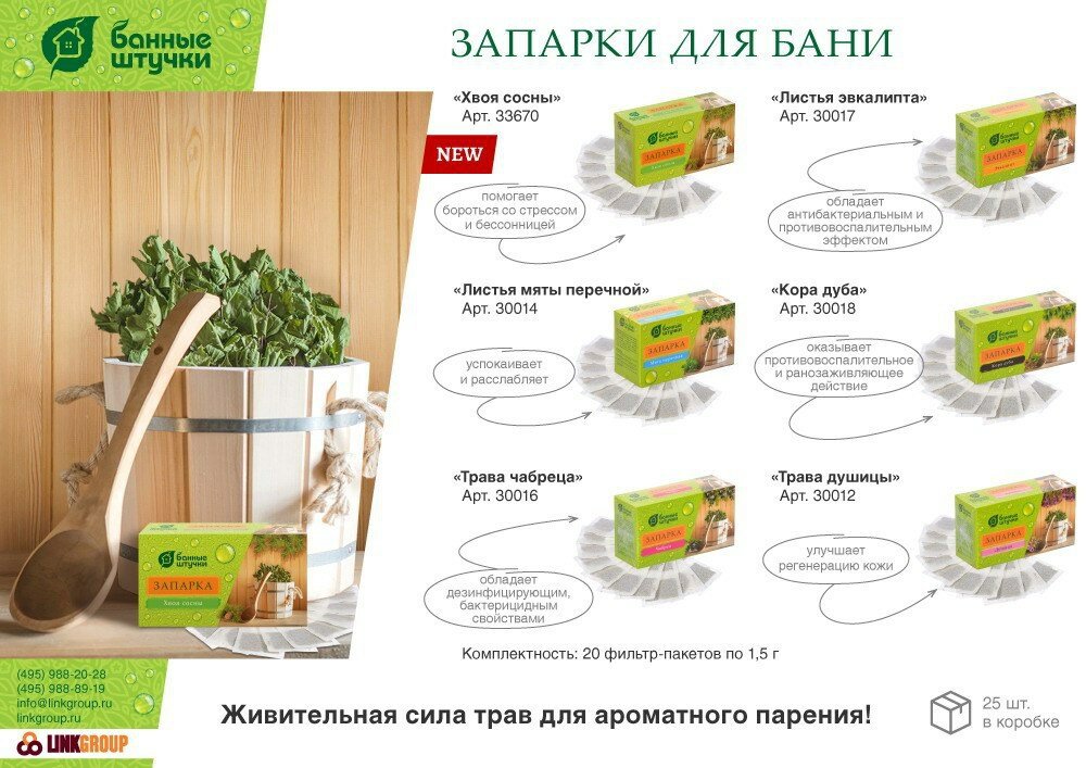 Способ использования: 2 фильтр-пакета залить 0,5 л кипятка, дать настояться 15 минут, плеснуть на раскалённые камни.