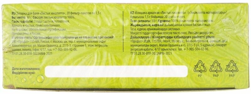 | Прочие особенности и свойства | Запарка для бани «Листья эвкалипта» – это уникальный сбор на основе листьев эвкалипта, а также отличный аксессуар для бани. В 20 фильтр-пакетиках сохранены все полезные свойства листьев эвкалипта, которые позволят вам долгое время наслаждаться их чистейшим ароматом и успокаивающим воздействием. Кроме того, каждый фильтр-пакетик обладает определенными целебными свойствами, благоприятно влияющими на здоровье человека.,Количество пакетиков в упаковке:20 шт.; |