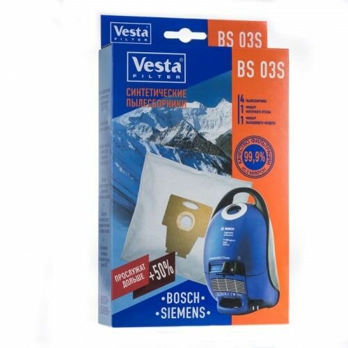 Синтетические пылесборники Vesta filter BS 03 S для пылесосов Bosch Siemens тип BBZ41FP. Произведены из синтетического микроволокна, обладают высокоэффективным качеством фильтрации в 99.9 % (0.3 микрон), обеспечивают очистку воздуха выходящего из пылесоса. Благодаря синтетическому материалу мешки Vesta filter BS 03S не боятся воды и острых предметов, сохраняют мощность пылесоса при заполнении, вмещают в себя больше содержимого чем мешки из бумаги. В комплектацию входят 4 пылесборника , 1 фильтр моторного отсека и 1 фильтр выходящего воздуха.