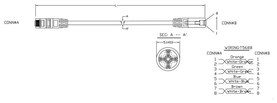 | Цвета витых пар | Зеленый-белый/зеленый, Коричневый-белый/коричневый, Оранжевый-белый/оранжевый, Синий-белый/синий |