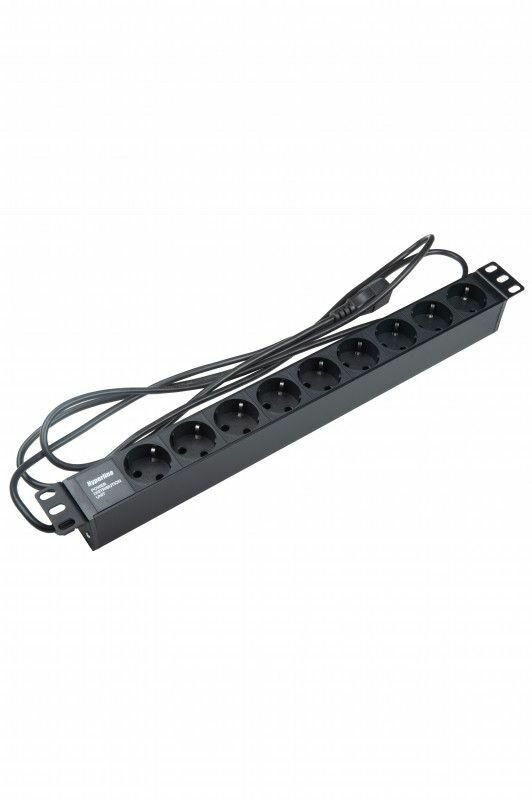 Hyperline SHE19-9SH-2.5IEC Блок розеток для 19" шкафов, горизонтальный, 9 розеток Schuko (10A), 250В, кабель питания 3х1.0мм2, длина 2.5 м, с вилкой IEC 320 C14, 482.6x44.4x44.4мм (ДхШхВ)