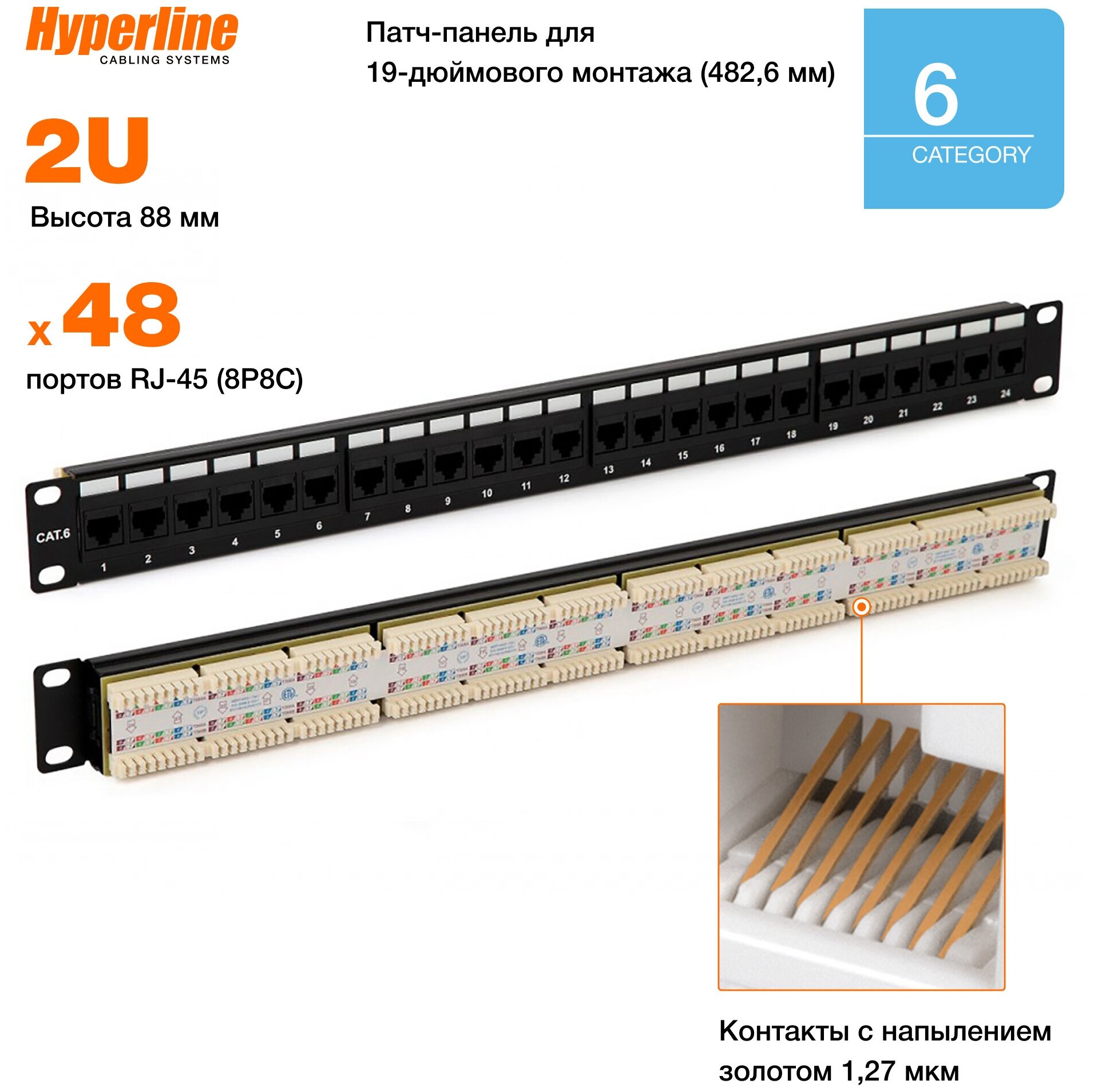 Патч-панель 19" Hyperline 2U 48 портов RJ-45 категория 6 Dual IDC ROHS цвет черный (задний кабельный организатор в комплекте) PP3-19-48-8P8C-C6-110D