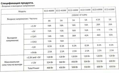| Максимальная нагрузка (сила тока по линиям) | Ток по линии +3.3 В 20 A, Ток по линии +5 В 17 A, Ток по линии +12 В 1 50 A, Ток по линии -12 В 0.3 A, Ток по линии +5 В Standby 2.5 A |
