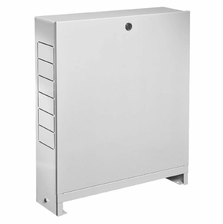 Настенные коллекторные шкафы (распределительные шкафы) предназначены для размещения в них коллекторов и коллекторных блоков систем внутреннего водопровода и отопления, а также смесительных узлов для водяного теплого пола. Монтаж шкафа осуществляется на стене. Откидная дверца имеет замок, защищающий установленное в шкафу оборудование от несанкционированного доступа. Внутри шкафа установлены передвижные монтажные рейки, к которым крепится оборудование. Коллекторные шкафы поставляются двух видов – встроенные, индекс «В» и настенные, индекс «Н».