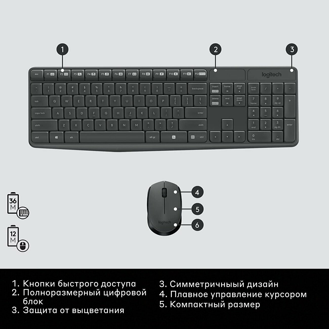 | Прочие особенности и свойства | Не требуется дополнительное обучение. С первого же дня вы ощутите комфорт и простоту использования стандартной раскладки этой полноразмерной клавиатуры., Без смены батареи клавиатура работает три года, а мышь — год. Срок работы клавиатуры от батарей (3 года) рассчитывался на основе стандартного значения, составляющего два миллиона нажатий клавиш в год в обычных условиях работы в офисе. Как и для всех батарей, срок работы зависит от режима эксплуатации и аппаратной конфигурации. |
