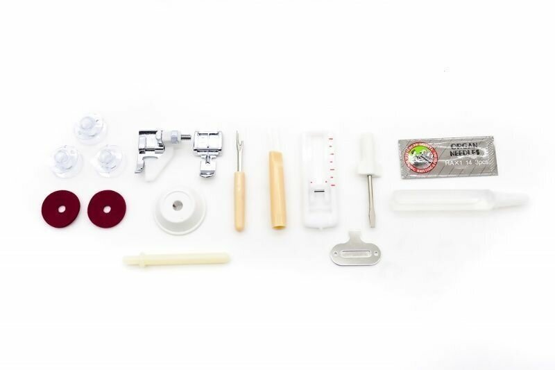 | Комплект поставки | педаль; руководство по эксплуатации; иглы стандартные; шпульки; распарыватель; отвертка; щеточка для чистки; лапка универсальная; лапка для обметывания петель; лапка для вшивания молнии; мягкий чехол |