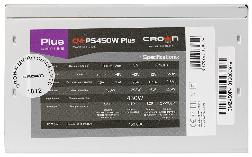 CROWN Блок питания (PEAK 450W, 20+4in 500mm, 4+4pin*1, SATA*3, MOLEX*2, 120mm FAN, I/O, пузырьковая упаковка)