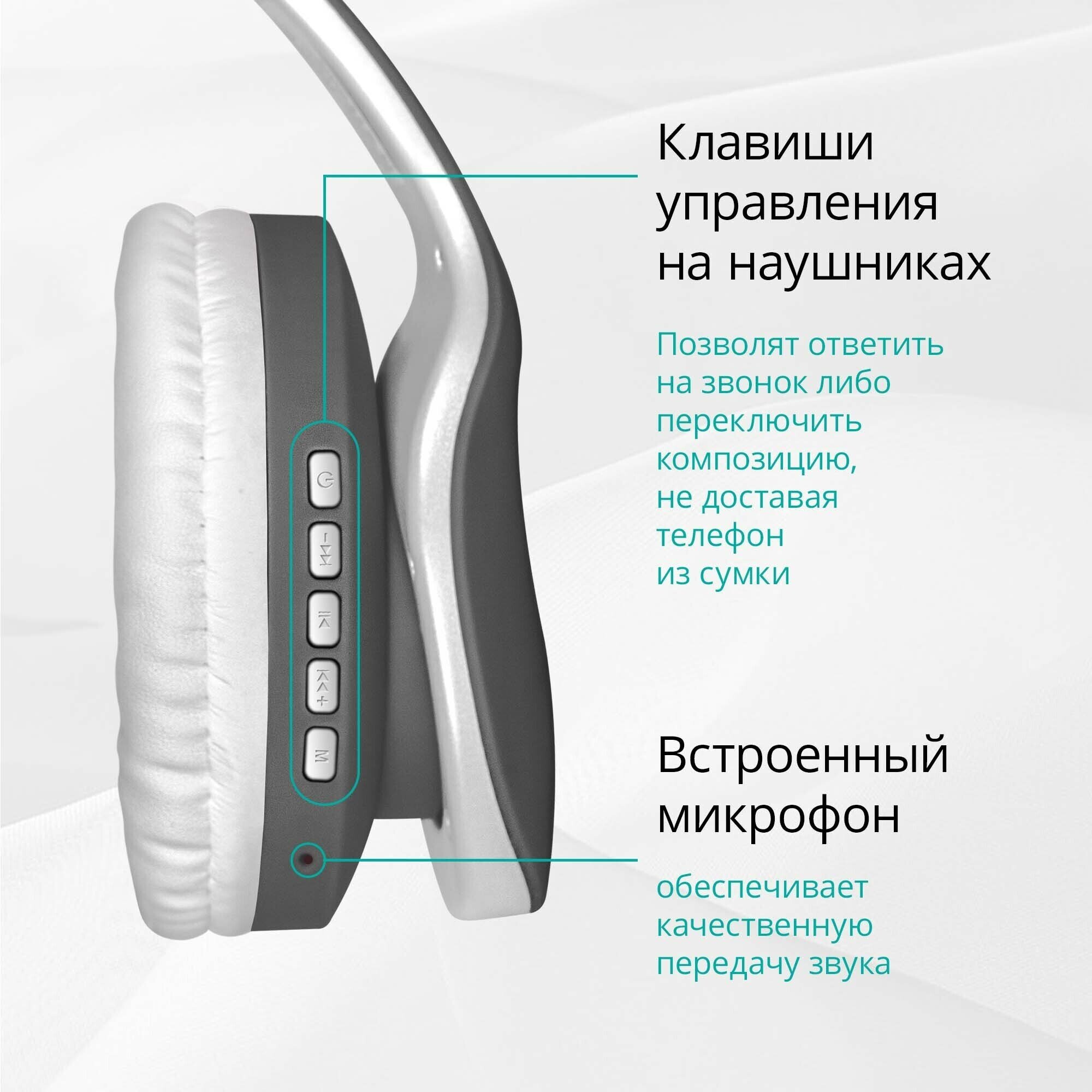 | Прочие особенности и свойства | Беспроводная Bluetooth-гарнитура Компактная складная конструкция позволяет легко сложить гарнитуру и взять с собой в поездку. Встроенный микрофон Встроенный микрофон обеспечивает качественную передачу звука. Слот для карты MicroSD Слот для карты памяти стандарта Micro-SD превращает наушники в MP3-плеер - слушайте музыку, не подключаясь к смартфону или ноутбуку. Встроенный FM-приемник Клавиши управления на наушниках Позволят ответить на звонок либо переключить композицию, не доставая телефон из сумки. Радиус действия - 10 м Гарнитура позволяет общаться по телефону или слушать интернет-радио с ноутбука, свободно перемещаясь по комнате. Аудиокабель в комплекте Если у вашей гарнитуры сел аккумулятор - просто подключите к ней кабель и продолжайте слушать музыку. Время работы аккумулятора до 8 часов Если гарнитура разрядится, просто подключите ее к USB-порту. Регулируемое оголовье Возможность подобрать наиболее удобную длину дужки. |