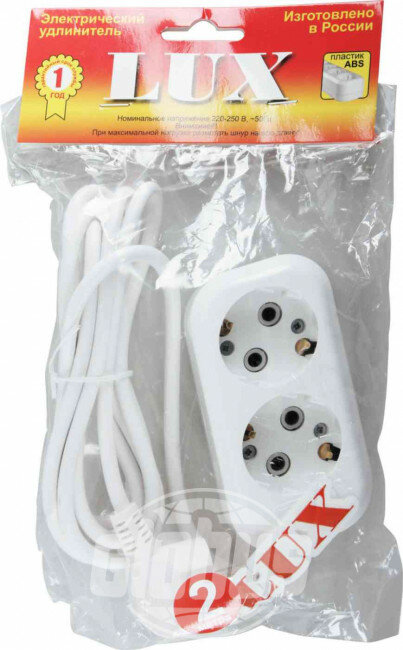 #Двухместный сетевой удлинитель с заземлением Lux ##У2-Е-02## - это прибор универсального применения. Он используется для работы в быту, офисе или в загородном доме. Удобен при эксплуатации с несколькими приборами и инструментами (до двух) одновременно. Корпус выполнен из АВС-пластика, который обеспечивает долговечность изделия. Такой удлинитель необходимо применять для работы с приборами, находящимися на удалении от стационарной розетки. Оснащен заземлением, наличие которого обеспечивает более безопасную работу для пользователя. Питающий провод ПВС 3х0.75 армирован неразборной литой вилкой с противоизломным элементом##.# #Внешний вид и/или характеристики товара могут быть изменены производителем в соответствии с производственным процессом##.#Внешний вид и/или характеристики товара могут быть изменены производителем в соответствии с производственным процессом.