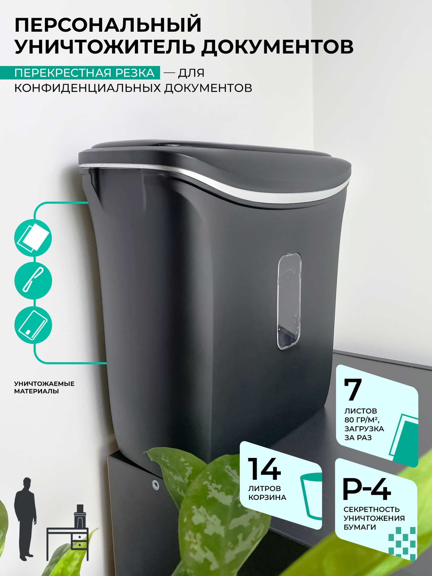 | Уничтожаемые предметы | бумага, пластиковые карты, скобы от степлера |