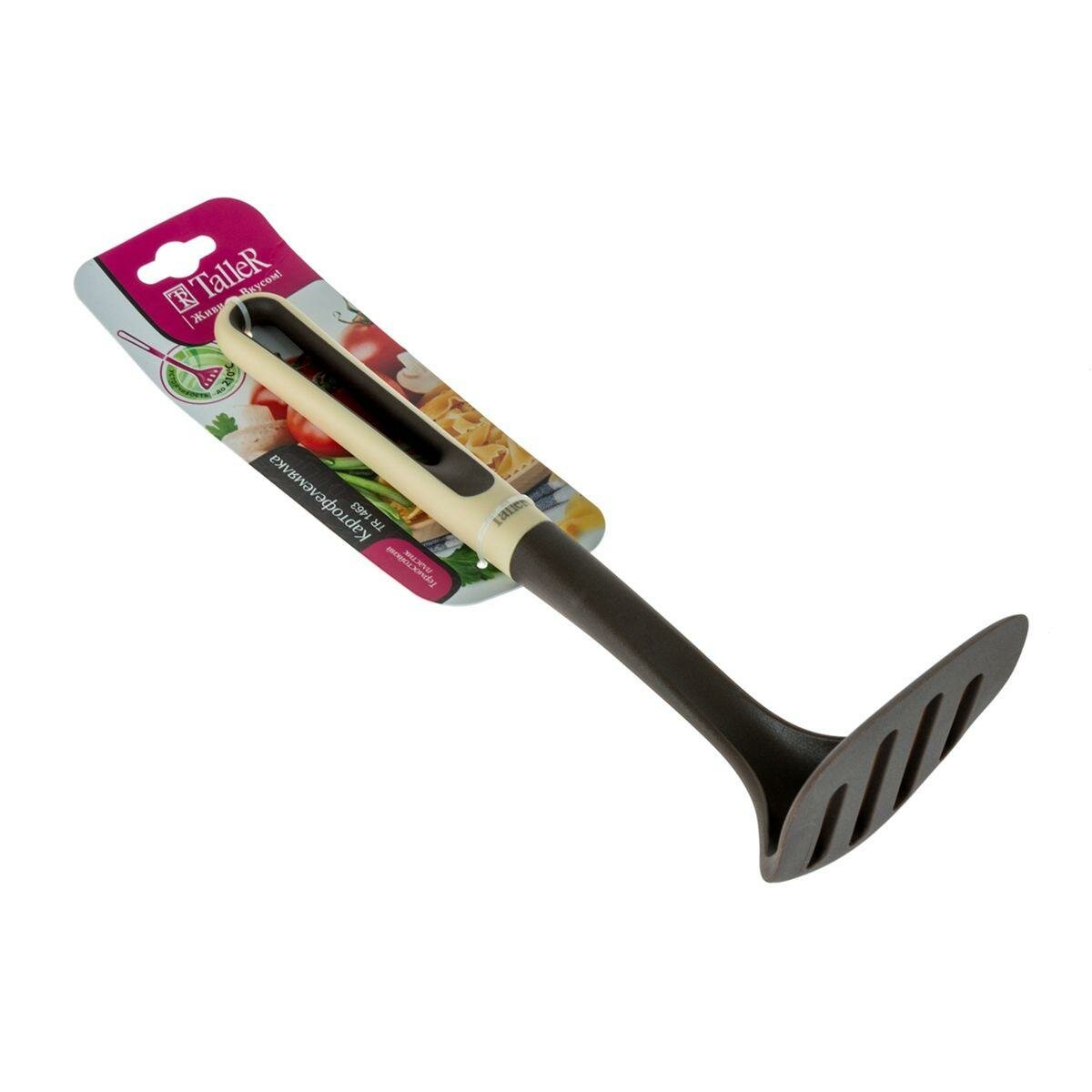 Картофелемялка TalleR — удобный и практичный кухонный инструмент, без которого невозможно приготовить мягкое и нежное пюре из картофеля. Продуманная конструкция позволяет быстро и без особых усилий растолочь вареную картошку или любые другие мягкие овощи, фрукты. За счет того, что рабочая часть выполнена из прочного термостойкого пластика, она не будет деформироваться даже при сильном нажатии. Данная картофелемялка отлично подойдет для использования с посудой с деликатным антипригарным покрытием.