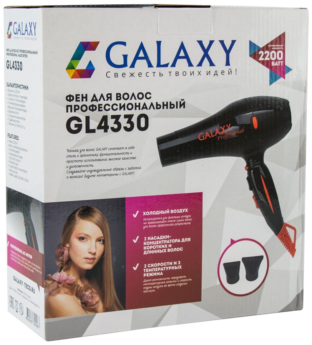 Мощный фен Galaxy GL4330 оснащен профессиональным АС-мотором и высокой мощностью 2200 Вт, благодаря чему подходит для интенсивного использования.